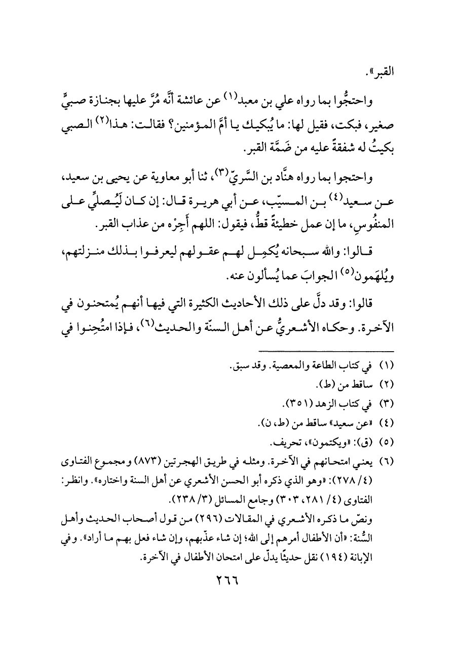 ونصّ ما ذكره الأشعري في المقالات (٢٩٦) من قول أصحاب الحديث وأهل السُّنة: «أن الأطفال أمرهم إلى الله؛ إن شاء عذّبهم، وإن شاء فعل بهم ما أراد». وفي الإبانة (١٩٤) نقل حديثًا يدلّ على امتحان الأطفال في الآخرة.