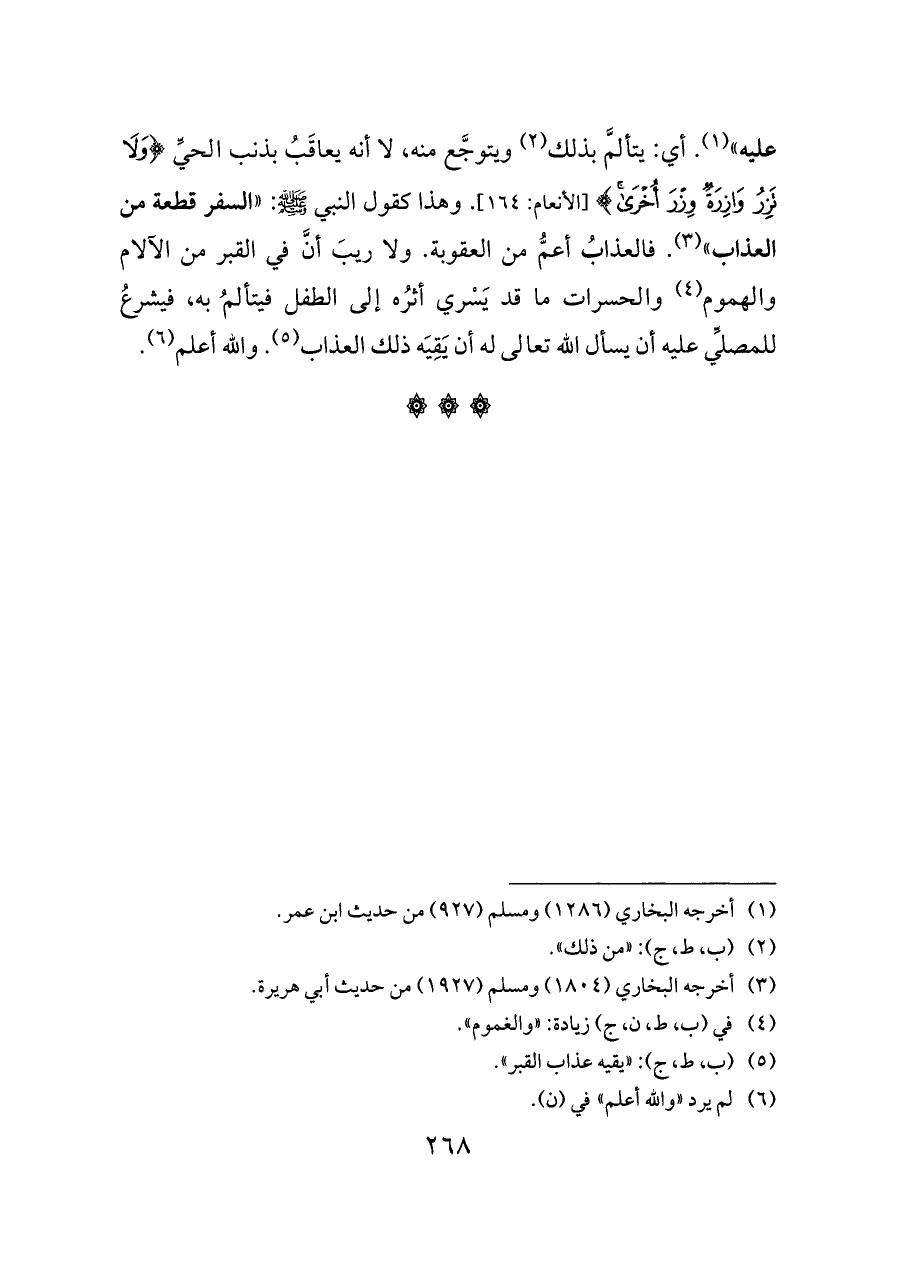 عليه» (¬١). أي: يتألَّم بذلك (¬٢) ويتوجَّع منه، لا أنه يعاقَبُ بذنب الحيِّ {وَلَا تَزِرُ وَازِرَةٌ وِزْرَ أُخْرَى} [الأنعام: ١٦٤]. وهذا كقول النبي - صلى الله عليه وسلم -: «السفر قطعة من العذاب» (¬٣). فالعذابُ أعمُّ من العقوبة. ولا ريبَ أنَّ في القبر من الآلام والهموم (¬٤) والحسرات ما قد يَسْري أثرُه إلى الطفل فيتألمُ به، فيشرعُ للمصلِّي عليه أن يسأل الله تعالى له أن يَقِيَه ذلك العذاب (¬٥). والله أعلم (¬٦).
