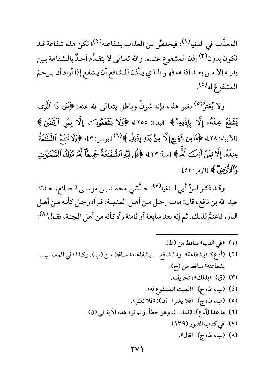 المعذَّب في الدنيا (¬١)، فيخلصُ من العذاب بشفاعته (¬٢)؛ لكن هذه شفاعة قد تكون بدون (¬٣) إذن المشفوع عنده. والله تعالى لا يتقدَّم أحدٌ بالشفاعة بين يديه إلا من بعد إذنه، فهو الذي يأذن للشافع أن يشفع إذا أراد أن يرحمَ المشفوعَ له (¬٤).