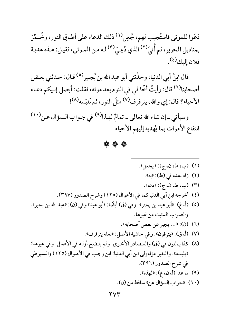 قال ابنُ أبي الدنيا: وحدَّثني أبو عبد الله بن بُجير (¬٥) قال: حدثني بعض أصحابنا (¬٦) قال: رأيتُ أخًا لي في النوم بعد موته، فقلت: أيصل إليكم دعاء الأحياء؟ قال: إي والله، يترفرف (¬٧) مثلَ النور، ثم نَلبَسه (¬٨)!