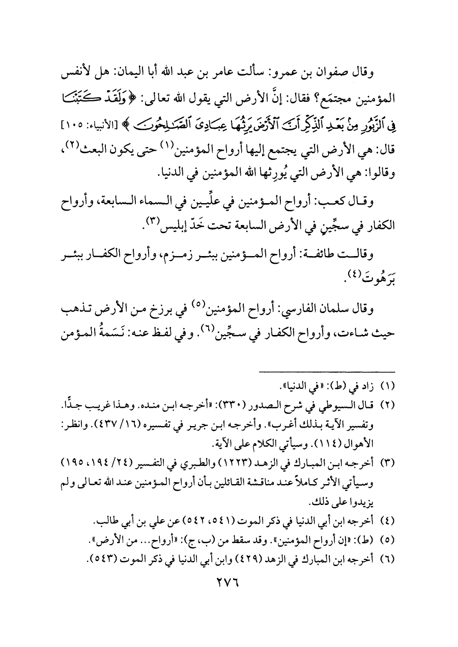 وقال صفوان بن عمرو: سألت عامر بن عبد الله أبا اليمان: هل لأنفس المؤمنين مجتمَع؟ فقال: إنَّ الأرض التي يقول الله تعالى: {وَلَقَدْ كَتَبْنَا فِي الزَّبُورِ مِنْ بَعْدِ الذِّكْرِ أَنَّ الْأَرْضَ يَرِثُهَا عِبَادِيَ الصَّالِحُونَ} [الأنبياء: ١٠٥] قال: هي الأرض التي يجتمع إليها أرواح المؤمنين (¬١) حتى يكون البعث (¬٢)، وقالوا: هي الأرض التي يُورِثها الله المؤمنين في الدنيا.