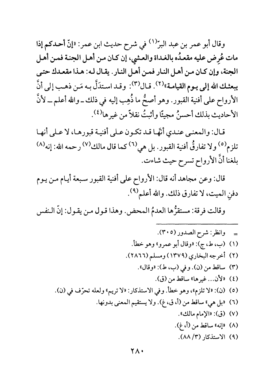 وقال أبو عمر بن عبد البرّ (¬١) في شرح حديث ابن عمر: «إنّ أحدكم إذا مات عُرِض عليه مقعدُه بالغداة والعشي، إن كان من أهل الجنة فمن أهل الجنة، وإن كان من أهل النار فمن أهل النار. يقال له: هذا مقعدك حتى يبعثك الله إلى يوم القيامة» (¬٢). قال (¬٣): وقد استدَلَّ به مَن ذهب إلى أنَّ الأرواح على أفنية القبور. وهو أصحُّ ما ذُهِب إليه في ذلك ــ والله أعلم ــ لأنَّ الأحاديث بذلك أحسنُ مجيئًا وأثبتُ نقلاً من غيرها (¬٤).