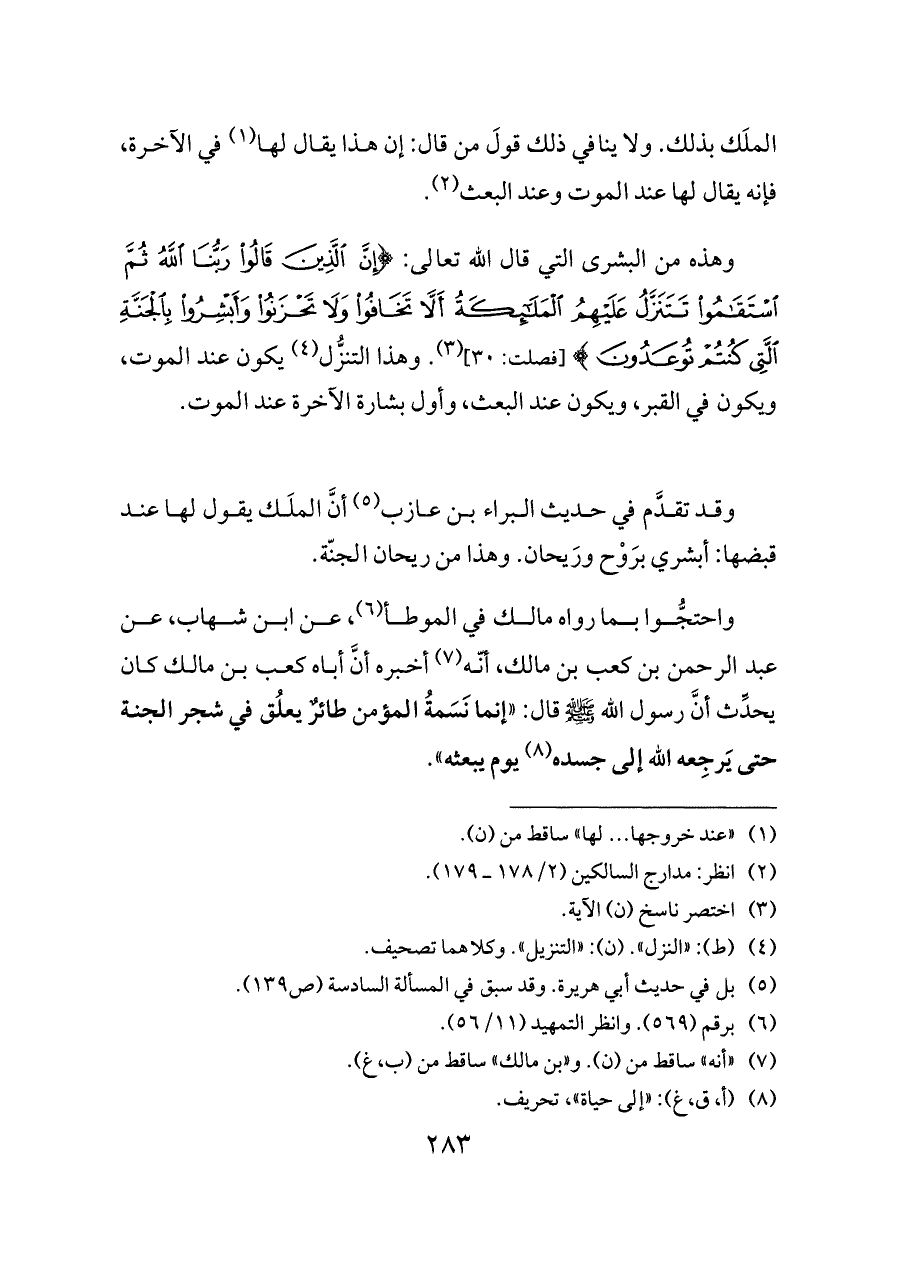 وهذه من البشرى التي قال الله تعالى: {إِنَّ الَّذِينَ قَالُوا رَبُّنَا اللَّهُ ثُمَّ اسْتَقَامُوا تَتَنَزَّلُ عَلَيْهِمُ الْمَلَائِكَةُ أَلَّا تَخَافُوا وَلَا تَحْزَنُوا وَأَبْشِرُوا بِالْجَنَّةِ الَّتِي كُنْتُمْ تُوعَدُونَ} [فصلت: ٣٠] (¬٣). وهذا التنزُّل (¬٤) يكون عند الموت، ويكون في القبر، ويكون عند البعث، وأول بشارة الآخرة عند الموت.
