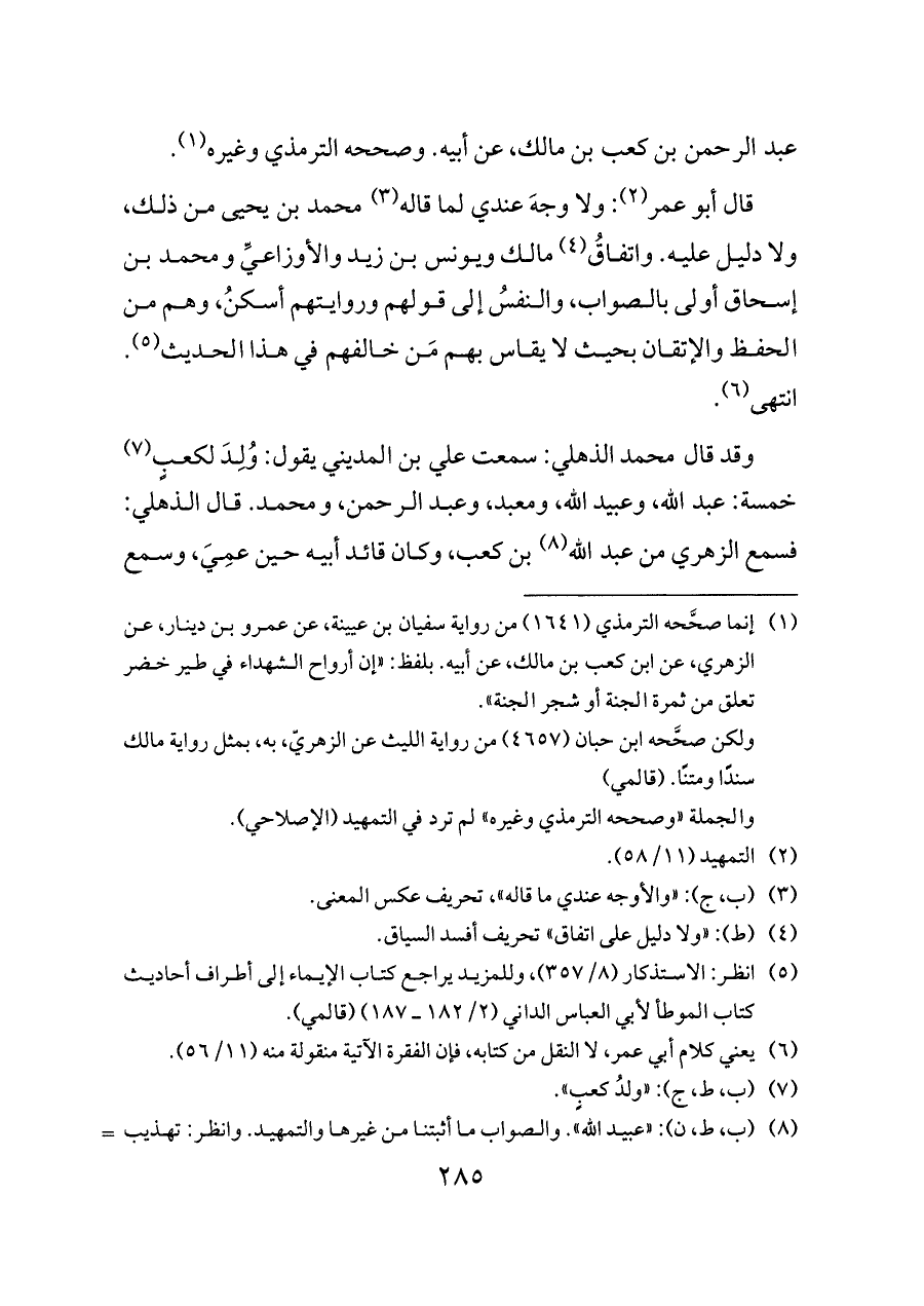 قال أبو عمر (¬٢): ولا وجهَ عندي لما قاله (¬٣) محمد بن يحيى من ذلك، ولا دليل عليه. واتفاقُ (¬٤) مالك ويونس بن زيد والأوزاعيِّ ومحمد بن إسحاق أولى بالصواب، والنفسُ إلى قولهم وروايتهم أسكنُ، وهم من الحفظ والإتقان بحيث لا يقاس بهم مَن خالفهم في هذا الحديث (¬٥). انتهى (¬٦).