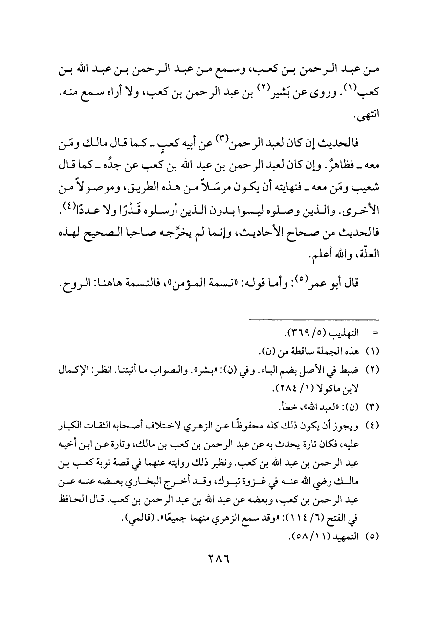 (¬٤) ويجوز أن يكون ذلك كله محفوظًا عن الزهري لاختلاف أصحابه الثقات الكبار عليه، فكان تارة يحدث به عن عبد الرحمن بن كعب بن مالك، وتارة عن ابن أخيه عبد الرحمن بن عبد الله بن كعب. ونظير ذلك روايته عنهما في قصة توبة كعب بن مالك رضي الله عنه في غزوة تبوك، وقد أخرج البخاري بعضه عنه عن عبد الرحمن بن كعب، وبعضه عن عبد الله بن عبد الرحمن بن كعب. قال الحافظ في الفتح (٦/ ١١٤): «وقد سمع الزهري منهما جميعًا». (قالمي).