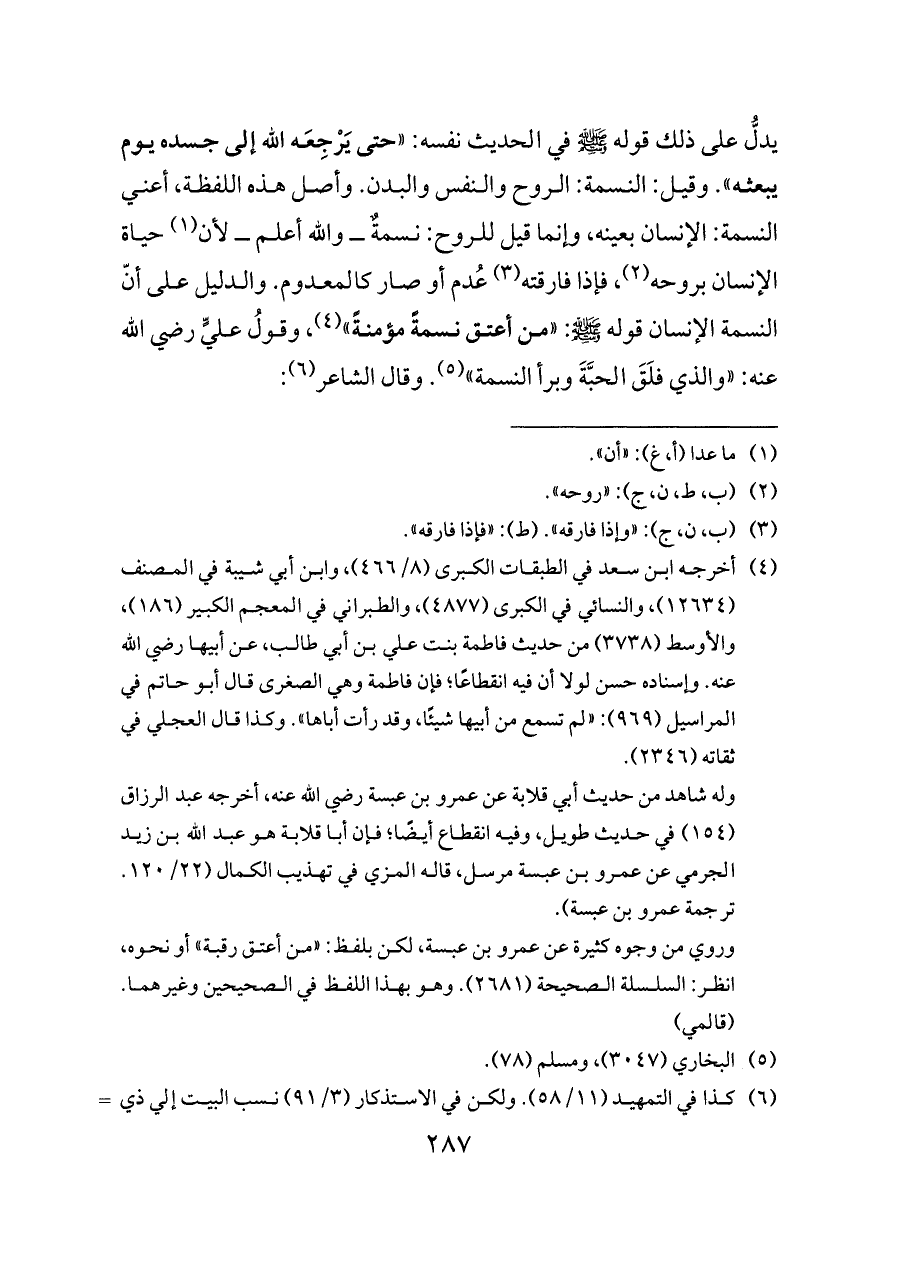 يدلُّ على ذلك قوله - صلى الله عليه وسلم - في الحديث نفسه: «حتى يَرْجِعَه الله إلى جسده يوم يبعثه». وقيل: النسمة: الروح والنفس والبدن. وأصل هذه اللفظة، أعني النسمة: الإنسان بعينه، وإنما قيل للروح: نسمةٌ ــ والله أعلم ــ لأن (¬١) حياة الإنسان بروحه (¬٢)، فإذا فارقته (¬٣) عُدم أو صار كالمعدوم. والدليل على أنّ النسمة الإنسان قوله - صلى الله عليه وسلم -: «من أعتق نسمةً مؤمنةً» (¬٤)، وقولُ عليٍّ رضي الله عنه: «والذي فلَقَ الحبَّةَ وبرأ النسمة» (¬٥). وقال الشاعر (¬٦):