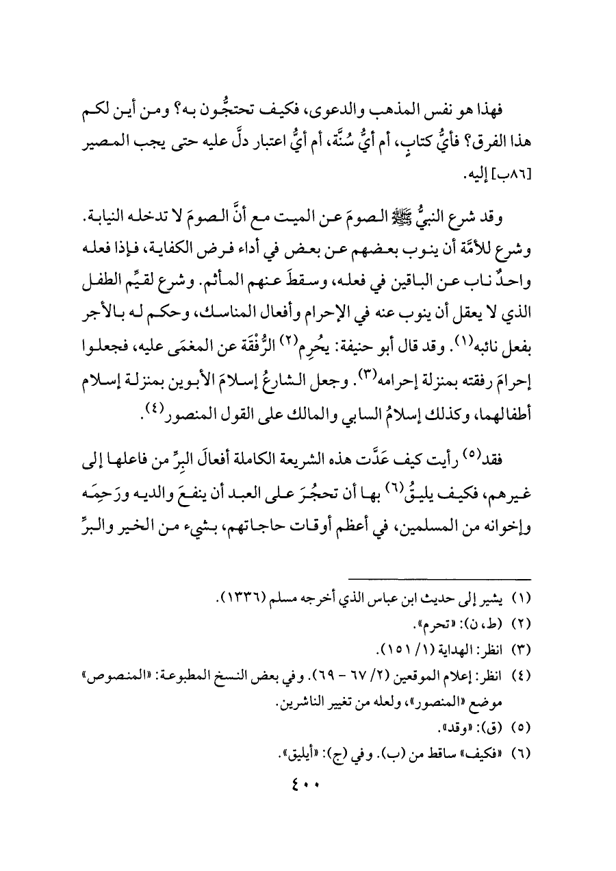 فقد (¬٥) رأيت كيف عَدَّت هذه الشريعة الكاملة أفعالَ البِرِّ من فاعلها إلى غيرهم، فكيف يليقُ (¬٦) بها أن تحجُرَ على العبد أن ينفعَ والديه ورَحِمَه وإخوانه من المسلمين، في أعظم أوقات حاجاتهم، بشيء من الخير والبرِّ