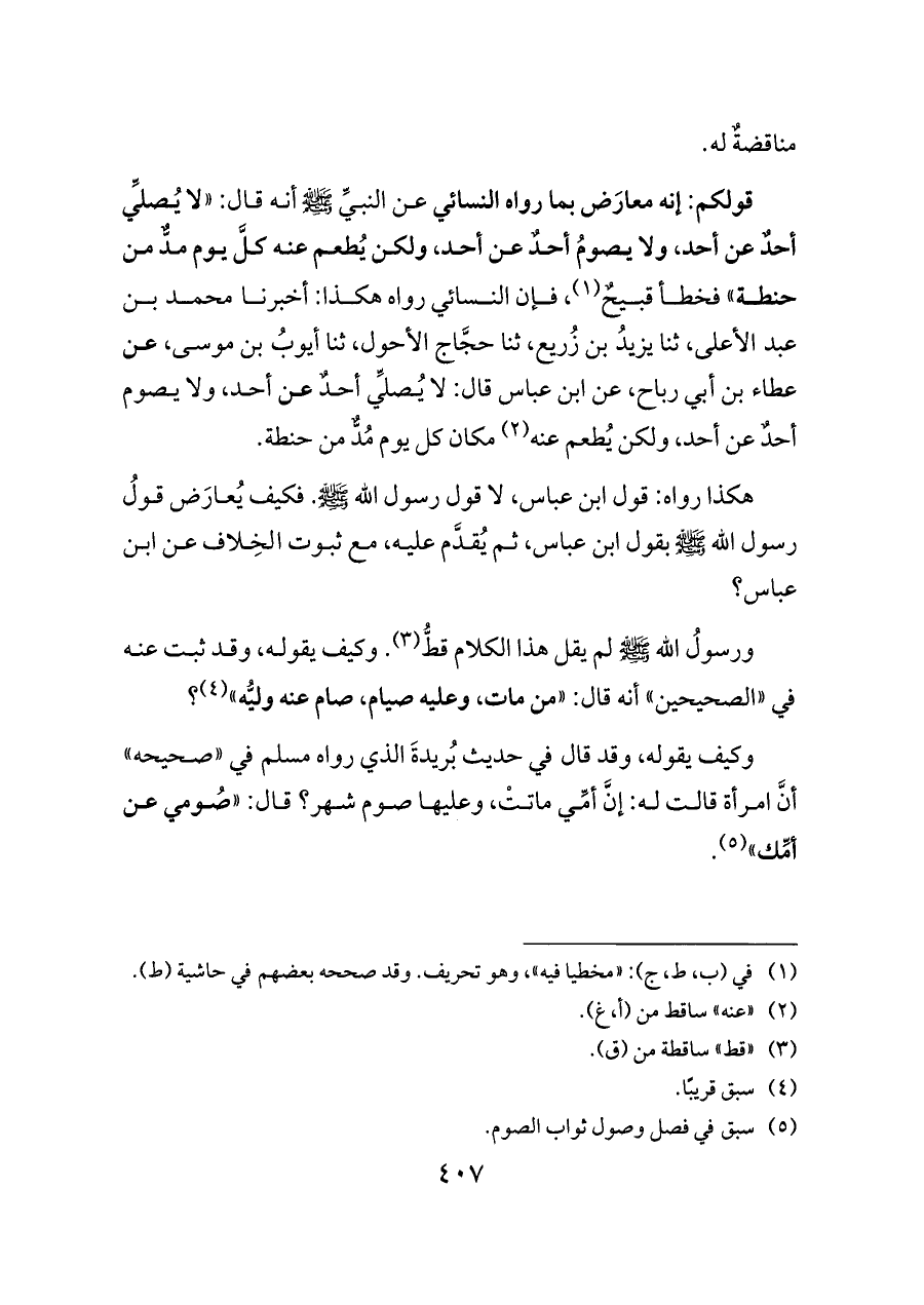 قولكم: إنه معارَض بما رواه النسائي عن النبيِّ - صلى الله عليه وسلم - أنه قال: «لا يُصلِّي أحدٌ عن أحد، ولا يصومُ أحدٌ عن أحد، ولكن يُطعم عنه كلَّ يوم مدٌّ من حنطة» فخطأ قبيحٌ (¬١)، فإن النسائي رواه هكذا: أخبرنا محمد بن عبد الأعلى، ثنا يزيدُ بن زُريع، ثنا حجَّاج الأحول، ثنا أيوبُ بن موسى، عن عطاء بن أبي رباح، عن ابن عباس قال: لا يُصلِّي أحدٌ عن أحد، ولا يصوم أحدٌ عن أحد، ولكن يُطعم عنه (¬٢) مكان كل يوم مُدٌّ من حنطة.