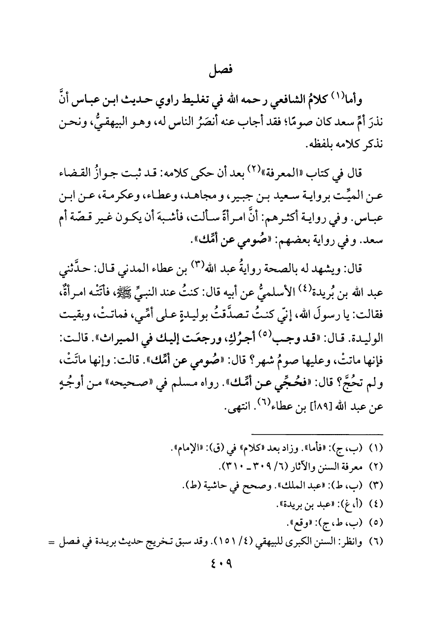 قال في كتاب «المعرفة» (¬٢) بعد أن حكى كلامه: قد ثبت جوازُ القضاء عن الميِّت برواية سعيد بن جبير، ومجاهد، وعطاء، وعكرمة، عن ابن عباس. وفي رواية أكثرهم: أنَّ امرأةً سألت، فأشبهَ أن يكون غير قصّة أم سعد. وفي رواية بعضهم: «صُومي عن أمِّك».