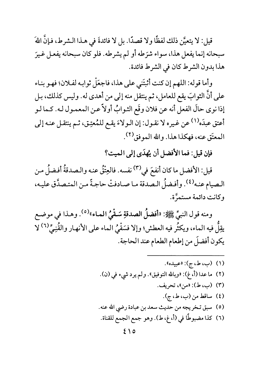 وأما قوله: اللهم إن كنت أثبتَني على هذا، فاجعَلْ ثوابه لفلان؛ فهو بناء على أنَّ الثوابَ يقع للعامل، ثم ينتقل منه إلى من أهدى له. وليس كذلك، بل إذا نوى حالَ الفعل أنه عن فلان وقَع الثوابُ أولاً عن المعمول له. كما لو أعتق عبدَه (¬١) عن غيره لا نقول: إن الولاءَ يقع للمُعتِق، ثم ينتقل عنه إلى المعتَق عنه، فهكذا هذا. والله الموفق (¬٢).
