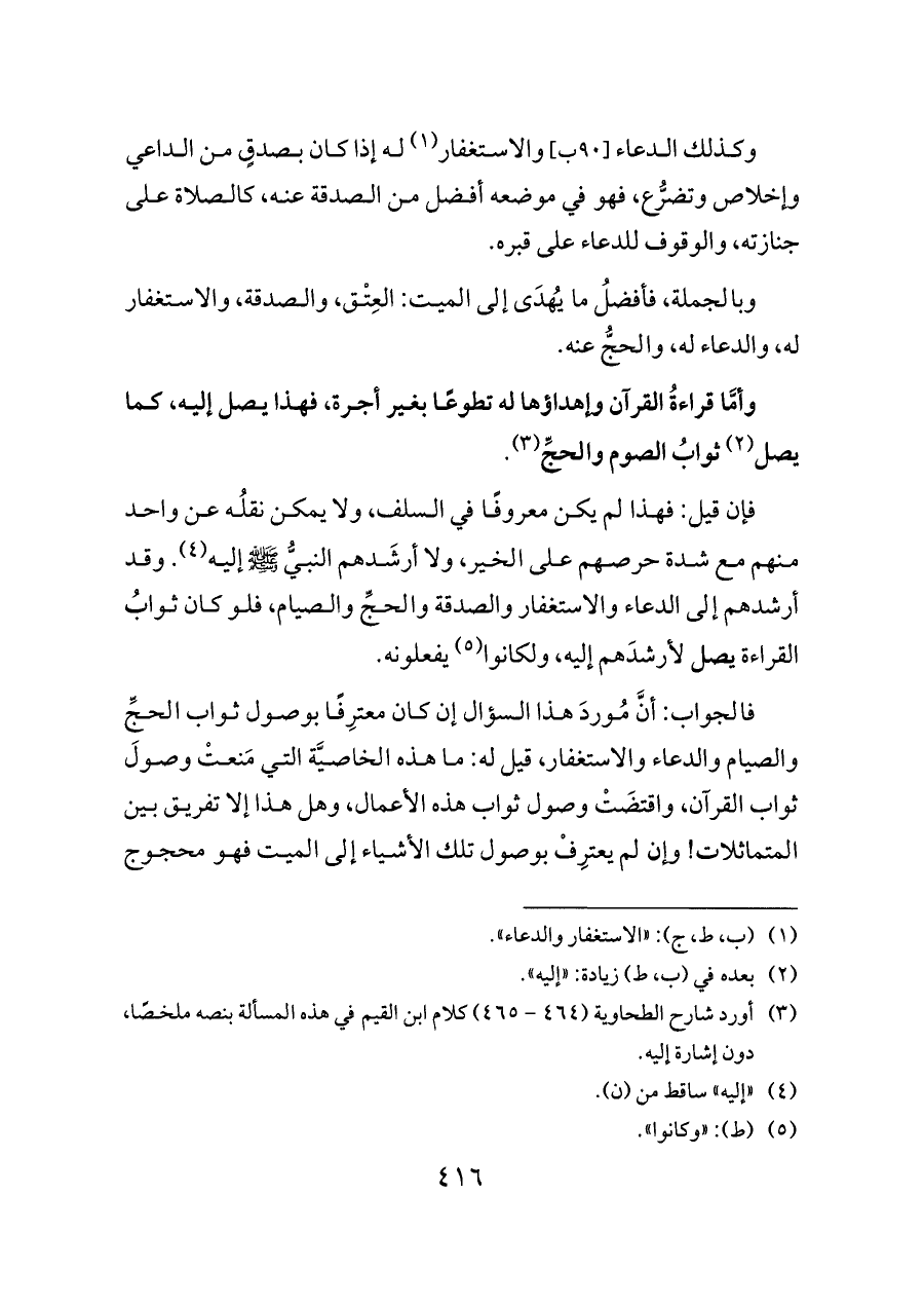 فالجواب: أنَّ مُوردَ هذا السؤال إن كان معترِفًا بوصول ثواب الحجِّ والصيام والدعاء والاستغفار، قيل له: ما هذه الخاصيَّة التي مَنعتْ وصولَ ثواب القرآن، واقتضَتْ وصول ثواب هذه الأعمال، وهل هذا إلا تفريق بين المتماثلات! وإن لم يعترِفْ بوصول تلك الأشياء إلى الميت فهو محجوج