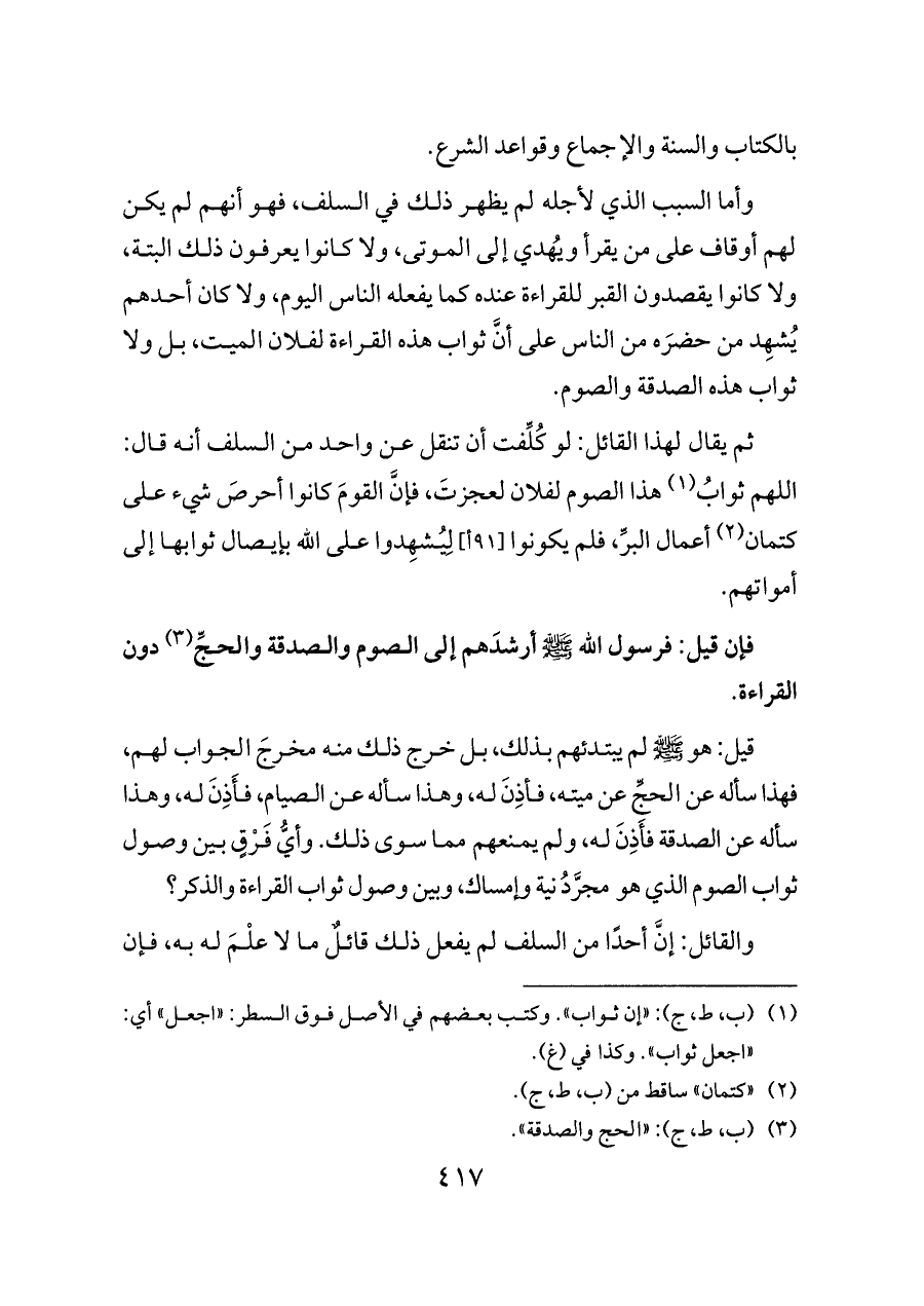 وأما السبب الذي لأجله لم يظهر ذلك في السلف، فهو أنهم لم يكن لهم أوقاف على من يقرأ ويُهدي إلى الموتى، ولا كانوا يعرفون ذلك البتة، ولا كانوا يقصدون القبر للقراءة عنده كما يفعله الناس اليوم، ولا كان أحدهم يُشهِد من حضرَه من الناس على أنَّ ثواب هذه القراءة لفلان الميت، بل ولا ثواب هذه الصدقة والصوم.