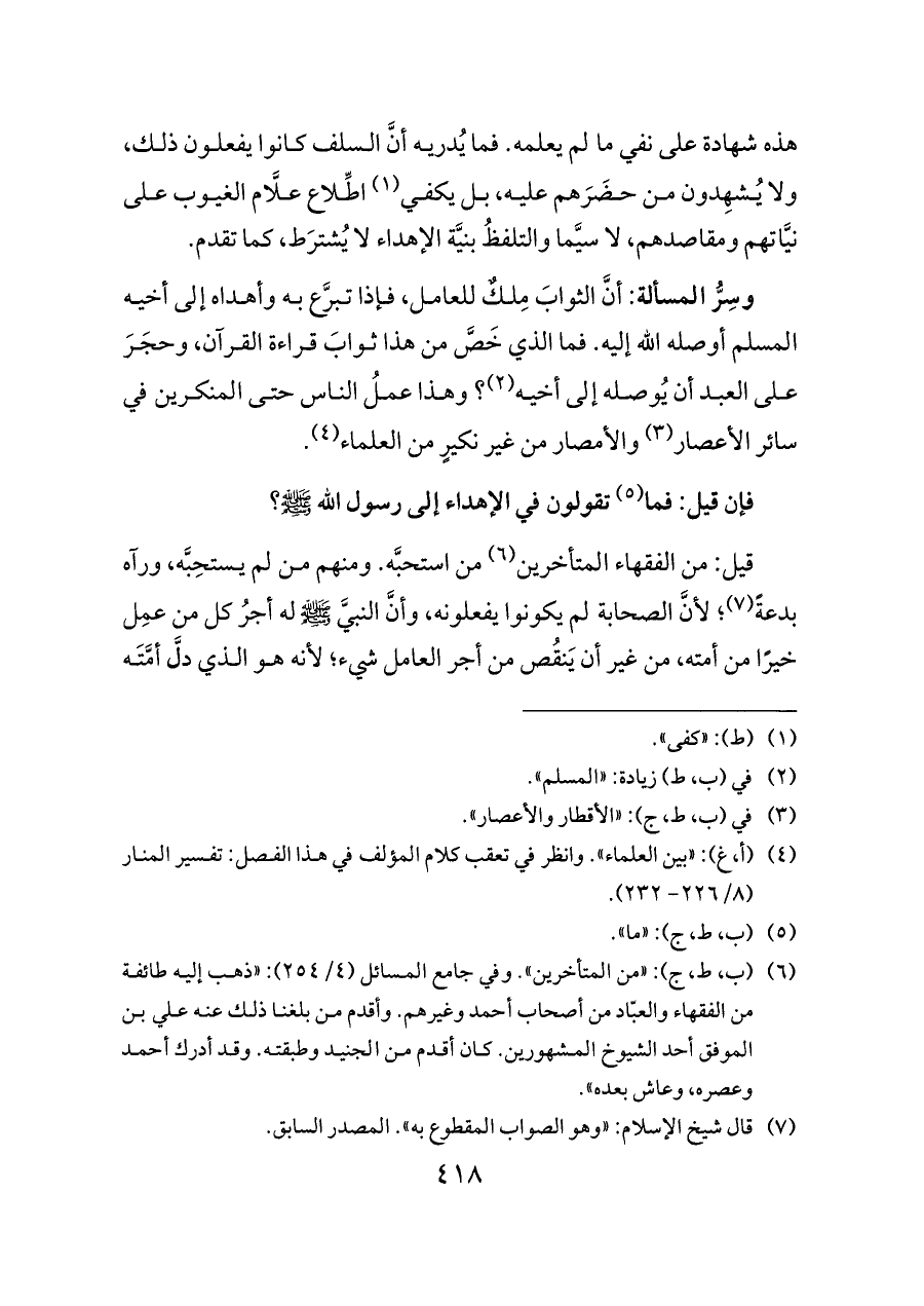 هذه شهادة على نفي ما لم يعلمه. فما يُدريه أنَّ السلف كانوا يفعلون ذلك، ولا يُشهِدون من حضَرَهم عليه، بل يكفي (¬١) اطِّلاع علَّام الغيوب على نيَّاتهم ومقاصدهم، لا سيَّما والتلفظُ بنيَّة الإهداء لا يُشترَط، كما تقدم.