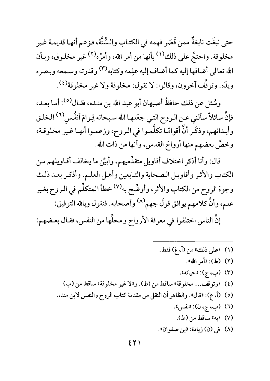 (¬٥) (أ، غ): «قال». والظاهر أن النقل من مقدمة كتاب الروح والنفس لابن منده.