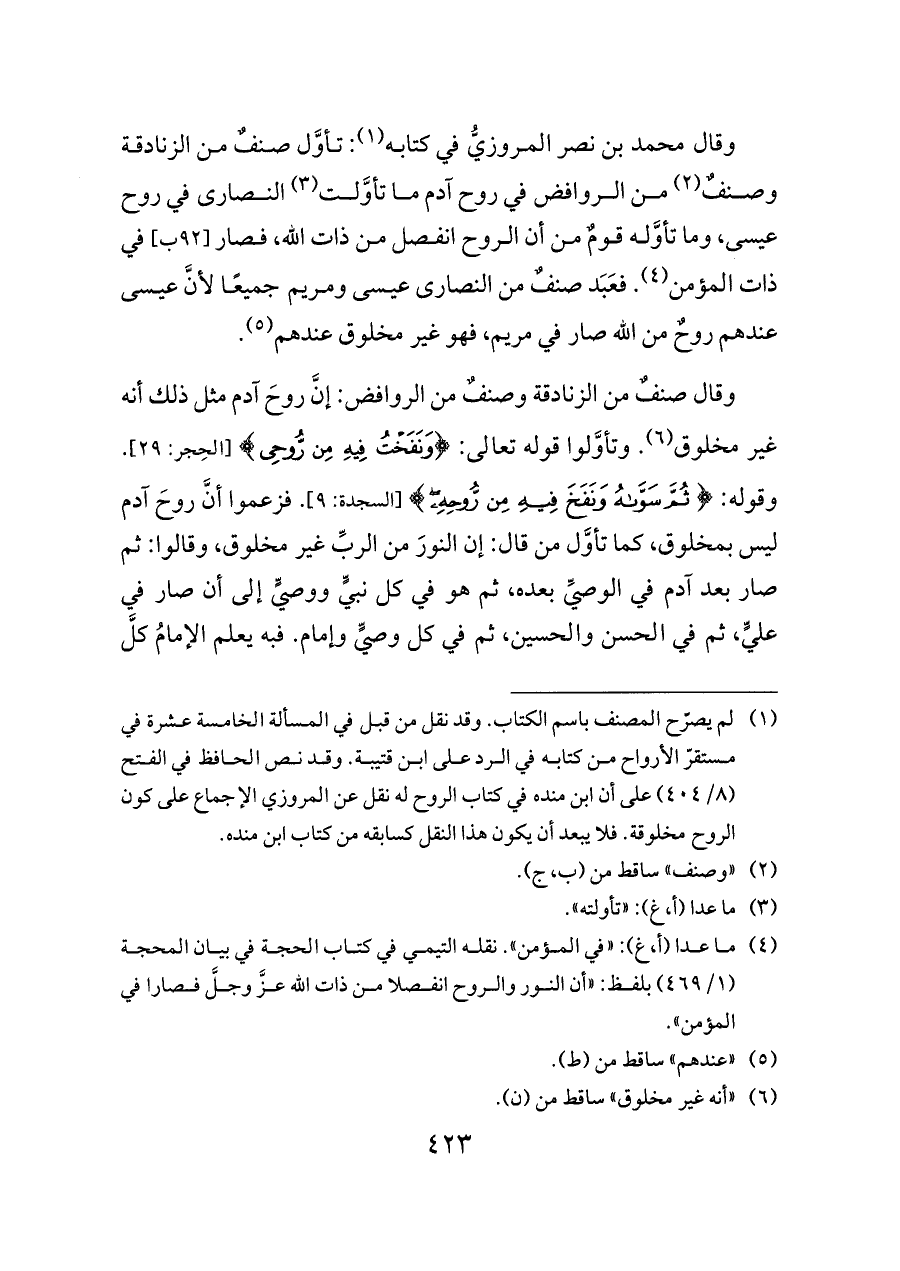 وقال صنفٌ من الزنادقة وصنفٌ من الروافض: إنَّ روحَ آدم مثل ذلك أنه غير مخلوق (¬٦). وتأوَّلوا قوله تعالى: {وَنَفَخْتُ فِيهِ مِنْ رُوحِي} [الحِجر: ٢٩]. وقوله: {ثُمَّ سَوَّاهُ وَنَفَخَ فِيهِ مِنْ رُوحِهِ} [السجدة: ٩]. فزعموا أنَّ روحَ آدم ليس بمخلوق، كما تأوَّل من قال: إن النورَ من الربِّ غير مخلوق، وقالوا: ثم صار بعد آدم في الوصيِّ بعده، ثم هو في كل نبيٍّ ووصيٍّ إلى أن صار في عليٍّ، ثم في الحسن والحسين، ثم في كل وصيٍّ وإمام. فبه يعلم الإمامُ كلَّ