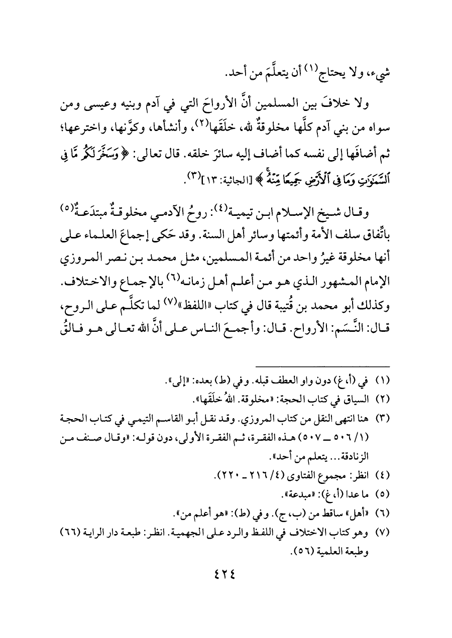 وقال شيخ الإسلام ابن تيمية (¬٤): روحُ الآدمي مخلوقةٌ مبتدَعةٌ (¬٥) باتِّفاق سلف الأمة وأئمتها وسائر أهل السنة. وقد حَكى إجماعَ العلماء على أنها مخلوقة غيرُ واحد من أئمة المسلمين، مثل محمد بن نصر المروزي الإمام المشهور الذي هو من أعلم أهل زمانه (¬٦) بالإجماع والاختلاف. وكذلك أبو محمد بن قُتيبة قال في كتاب «اللفظ» (¬٧) لما تكلَّم على الروح، قال: النَّسَم: الأرواح. قال: وأجمعَ الناس على أنَّ الله تعالى هو فالقُ