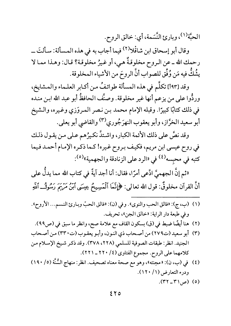 وقد [٩٣ أ] تكلَّم في هذه المسألة طوائفُ من أكابر العلماء والمشايخ، وردُّوا على من يزعم أنها غير مخلوقة. وصنَّف الحافظُ أبو عبد الله ابن منده في ذلك كتابًا كبيرًا. وقبله الإمام محمد بن نصر المروَزي وغيره، والشيخ أبو سعيد الخرَّاز، وأبو يعقوب النهرَجُوري (¬٣) والقاضي أبو يعلى.