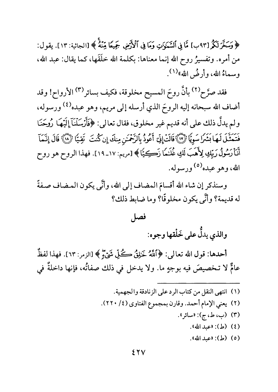 فقد صرَّح (¬٢) بأنَّ روحَ المسيح مخلوقة، فكيف بسائر (¬٣) الأرواح! وقد أضاف الله سبحانه إليه الروحَ الذي أرسله إلى مريم، وهو عبده (¬٤) ورسوله، ولم يدلَّ ذلك على أنه قديم غير مخلوق، فقال تعالى: {فَأَرْسَلْنَا إِلَيْهَا رُوحَنَا فَتَمَثَّلَ لَهَا بَشَرًا سَوِيًّا (١٧) قَالَتْ إِنِّي أَعُوذُ بِالرَّحْمَنِ مِنْكَ إِنْ كُنْتَ تَقِيًّا (١٨) قَالَ إِنَّمَا أَنَا رَسُولُ رَبِّكِ لِأَهَبَ لَكِ غُلَامًا زَكِيًّا} [مريم: ١٧ ــ ١٩]. فهذا الروح هو روح الله، وهو عبده (¬٥) ورسوله.
