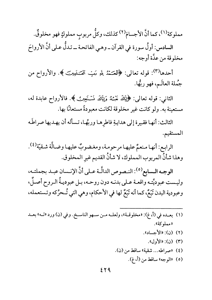 السادس: أولُ سورة في القرآن ــ وهي الفاتحة ــ تدلُّ على أنَّ الأرواحَ مخلوقة من عدَّة أوجه: