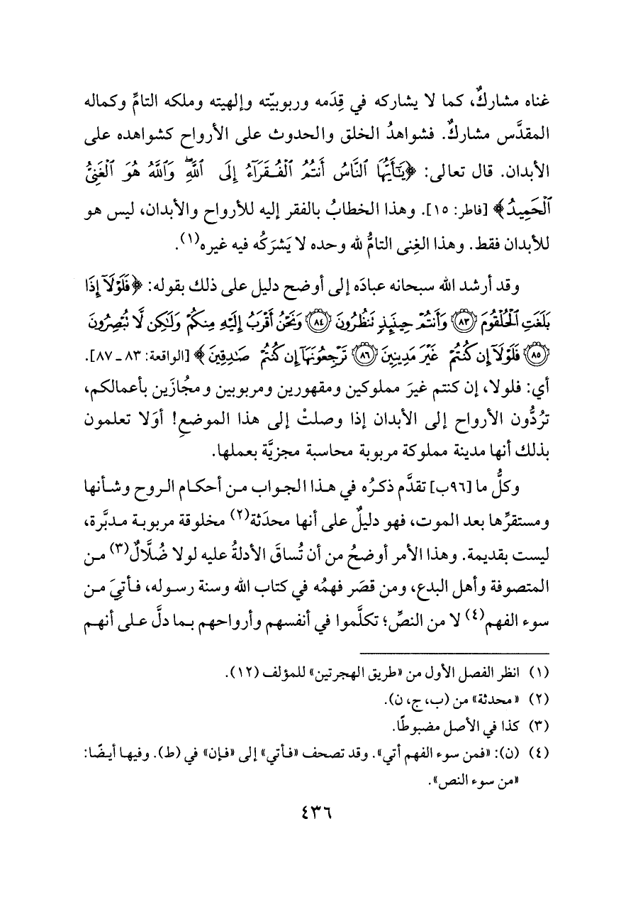 وكلُّ ما [٩٦ ب] تقدَّم ذكرُه في هذا الجواب من أحكام الروح وشأنها ومستقرِّها بعد الموت، فهو دليلٌ على أنها محدَثة (¬٢) مخلوقة مربوبة مدبَّرة، ليست بقديمة. وهذا الأمر أوضحُ من أن تُساقَ الأدلةُ عليه لولا ضُلَّالٌ (¬٣) من المتصوفة وأهل البدع، ومن قصَر فهمُه في كتاب الله وسنة رسوله، فأتِيَ من سوء الفهم (¬٤) لا من النصِّ؛ تكلَّموا في أنفسهم وأرواحهم بما دلَّ على أنهم