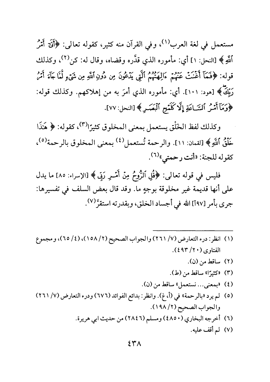 وكذلك لفظ الخَلْق يستعمل بمعنى المخلوق كثيرًا (¬٣)، كقوله: {هَذَا خَلْقُ اللَّهِ} [لقمان: ١١]. والرحمة تُستعمل (¬٤) بمعنى المخلوق بالرحمة (¬٥)، كقوله للجنة: «أنت رحمتي» (¬٦).