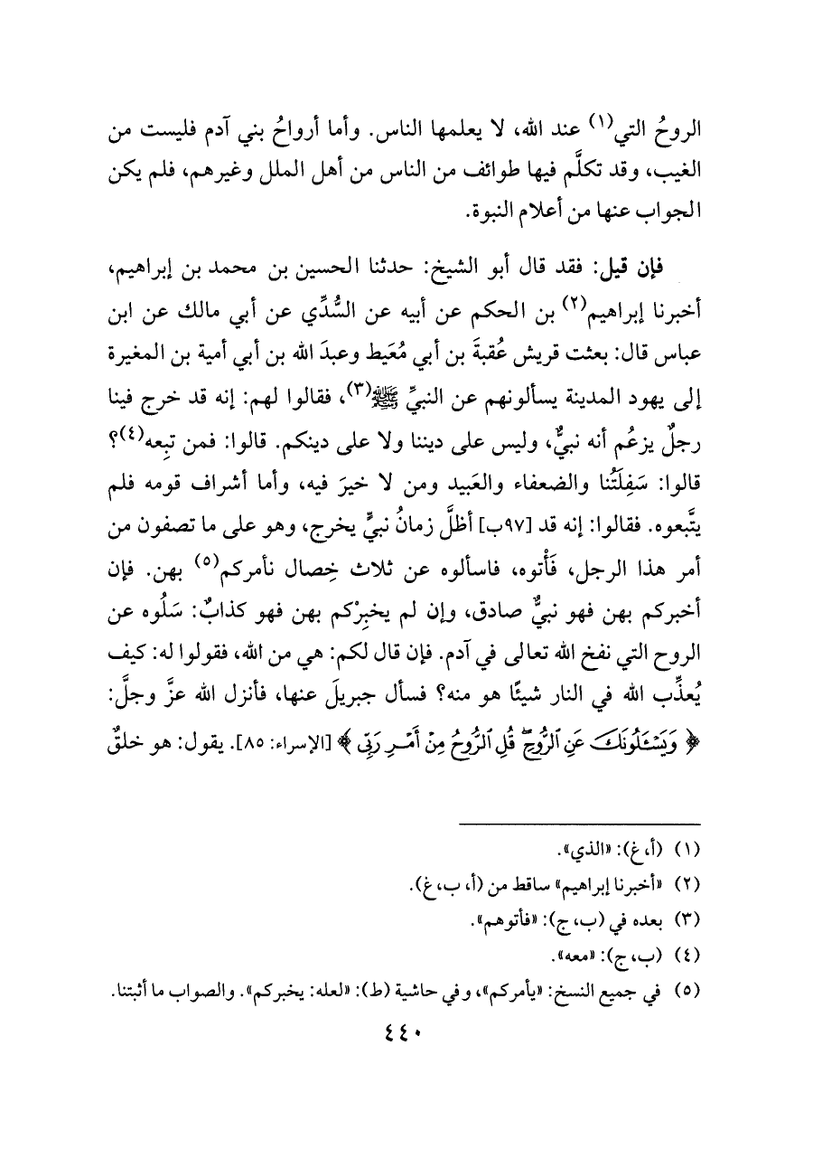 فإن قيل: فقد قال أبو الشيخ: حدثنا الحسين بن محمد بن إبراهيم، أخبرنا إبراهيم (¬٢) بن الحكم عن أبيه عن السُّدِّي عن أبي مالك عن ابن عباس قال: بعثت قريش عُقبةَ بن أبي مُعَيط وعبدَ الله بن أبي أمية بن المغيرة إلى يهود المدينة يسألونهم عن النبيِّ - صلى الله عليه وسلم - (¬٣)، فقالوا لهم: إنه قد خرج فينا رجلٌ يزعُم أنه نبيٌّ، وليس على ديننا ولا على دينكم. قالوا: فمن تبِعه (¬٤)؟ قالوا: سَفِلَتُنا والضعفاء والعَبيد ومن لا خيرَ فيه، وأما أشراف قومه فلم يتَّبعوه. فقالوا: إنه قد [٩٧ ب] أظلَّ زمانُ نبيٍّ يخرج، وهو على ما تصفون من أمر هذا الرجل، فَأْتوه، فاسألوه عن ثلاث خِصال نأمركم (¬٥) بهن. فإن أخبركم بهن فهو نبيٌّ صادق، وإن لم يخبِرْكم بهن فهو كذابٌ: سَلُوه عن الروح التي نفخ الله تعالى في آدم. فإن قال لكم: هي من الله، فقولوا له: كيف يُعذِّب الله في النار شيئًا هو منه؟ فسأل جبريلَ عنها، فأنزل الله عزَّ وجلَّ: {وَيَسْأَلُونَكَ عَنِ الرُّوحِ قُلِ الرُّوحُ مِنْ أَمْرِ رَبِّي} [الإسراء: ٨٥]. يقول: هو خلقٌ