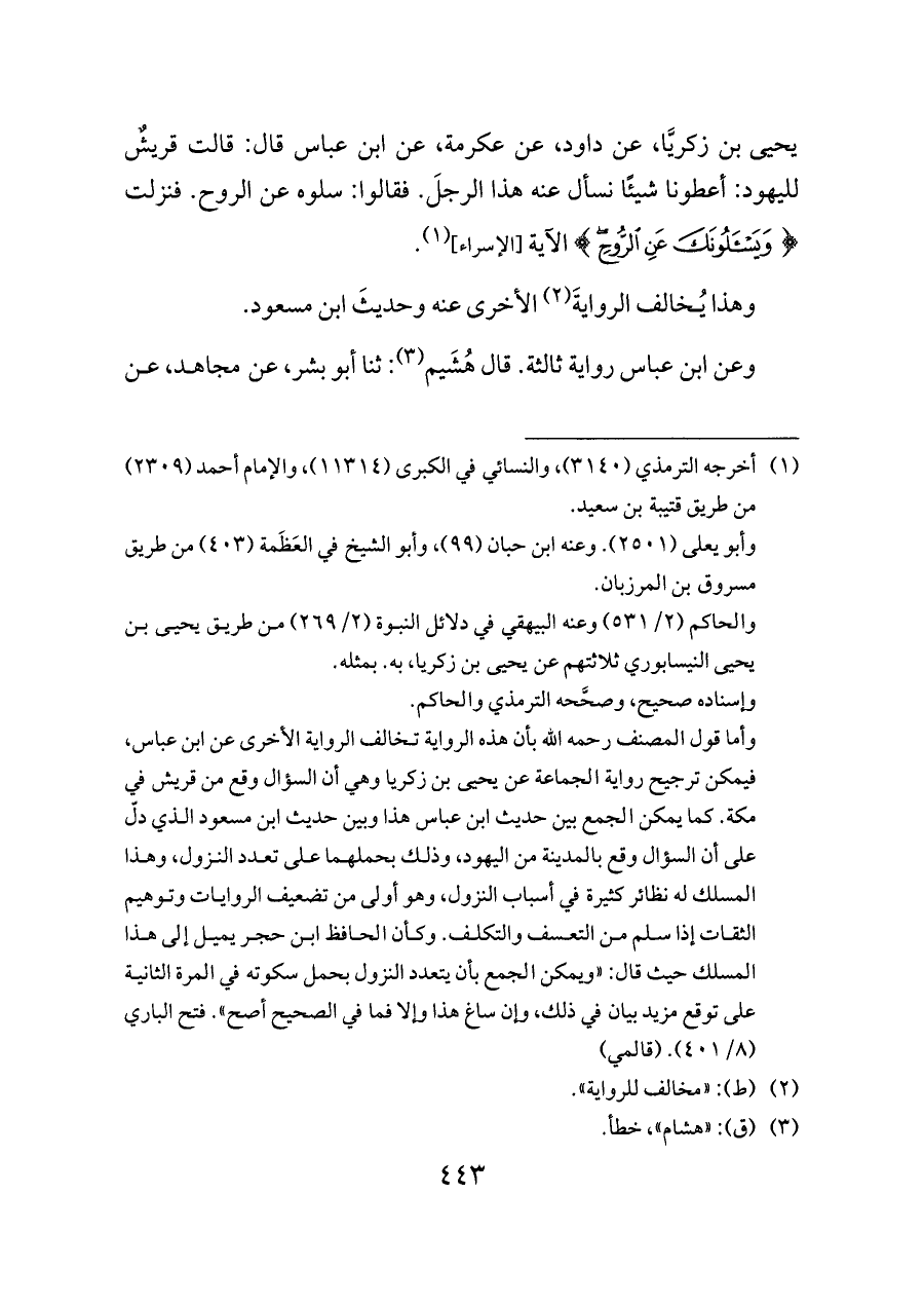وأما قول المصنف رحمه الله بأن هذه الرواية تخالف الرواية الأخرى عن ابن عباس، فيمكن ترجيح رواية الجماعة عن يحيى بن زكريا وهي أن السؤال وقع من قريش في مكة. كما يمكن الجمع بين حديث ابن عباس هذا وبين حديث ابن مسعود الذي دلّ على أن السؤال وقع بالمدينة من اليهود، وذلك بحملهما على تعدد النزول، وهذا المسلك له نظائر كثيرة في أسباب النزول، وهو أولى من تضعيف الروايات وتوهيم الثقات إذا سلم من التعسف والتكلف. وكأن الحافظ ابن حجر يميل إلى هذا المسلك حيث قال: «ويمكن الجمع بأن يتعدد النزول بحمل سكوته في المرة الثانية على توقع مزيد بيان في ذلك، وإن ساغ هذا وإلا فما في الصحيح أصح». فتح الباري (٨/ ٤٠١). (قالمي)