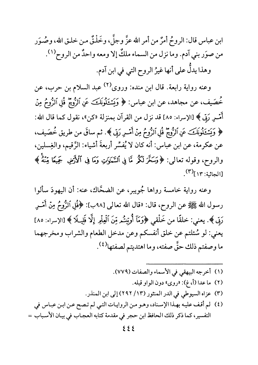 وعنه رواية رابعة. قال ابن منده: وروى (¬٢) عبد السلام بن حرب، عن خُصَيف، عن مجاهد، عن ابن عباس: {وَيَسْأَلُونَكَ عَنِ الرُّوحِ قُلِ الرُّوحُ مِنْ أَمْرِ رَبِّي} [الإسراء: ٨٥] قد نزل من القرآن بمنزلة «كن»، نقول كما قال الله: {وَيَسْأَلُونَكَ عَنِ الرُّوحِ قُلِ الرُّوحُ مِنْ أَمْرِ رَبِّي}. ثم ساقَ من طريق خُصَيف، عن عكرمة، عن ابن عباس: أنه كان لا يُفسِّر أربعةَ أشياء: الرَّقيم، والغِسلين، والروح، وقوله تعالى: {وَسَخَّرَ لَكُمْ مَا فِي السَّمَاوَاتِ وَمَا فِي الْأَرْضِ جَمِيعًا مِنْهُ} [الجاثية: ١٣] (¬٣).