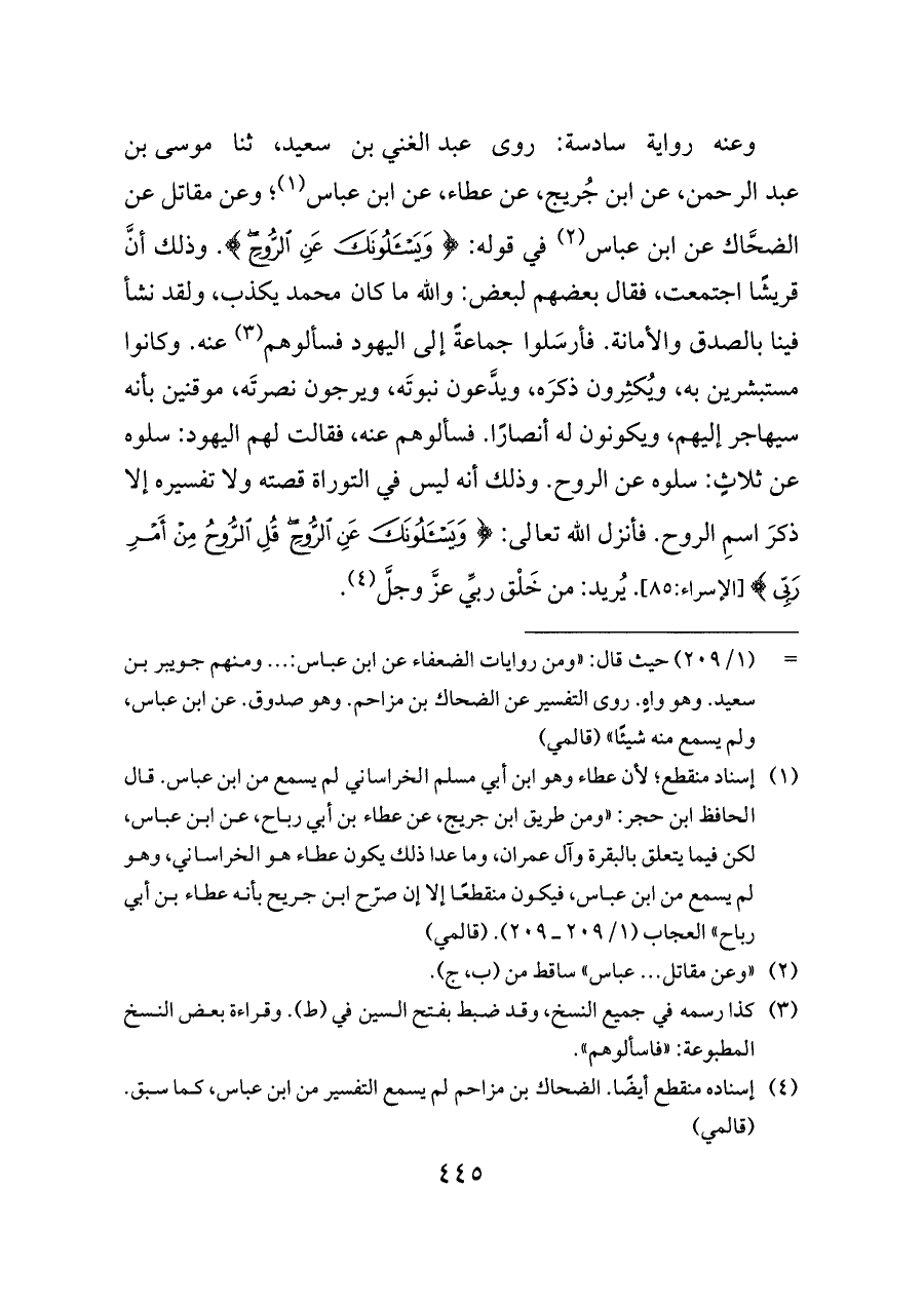(¬١) إسناد منقطع؛ لأن عطاء وهو ابن أبي مسلم الخراساني لم يسمع من ابن عباس. قال الحافظ ابن حجر: «ومن طريق ابن جريج، عن عطاء بن أبي رباح، عن ابن عباس، لكن فيما يتعلق بالبقرة وآل عمران، وما عدا ذلك يكون عطاء هو الخراساني، وهو لم يسمع من ابن عباس، فيكون منقطعًا إلا إن صرّح ابن جريح بأنه عطاء بن أبي رباح» العجاب (١/ ٢٠٩ ــ ٢٠٩). (قالمي)