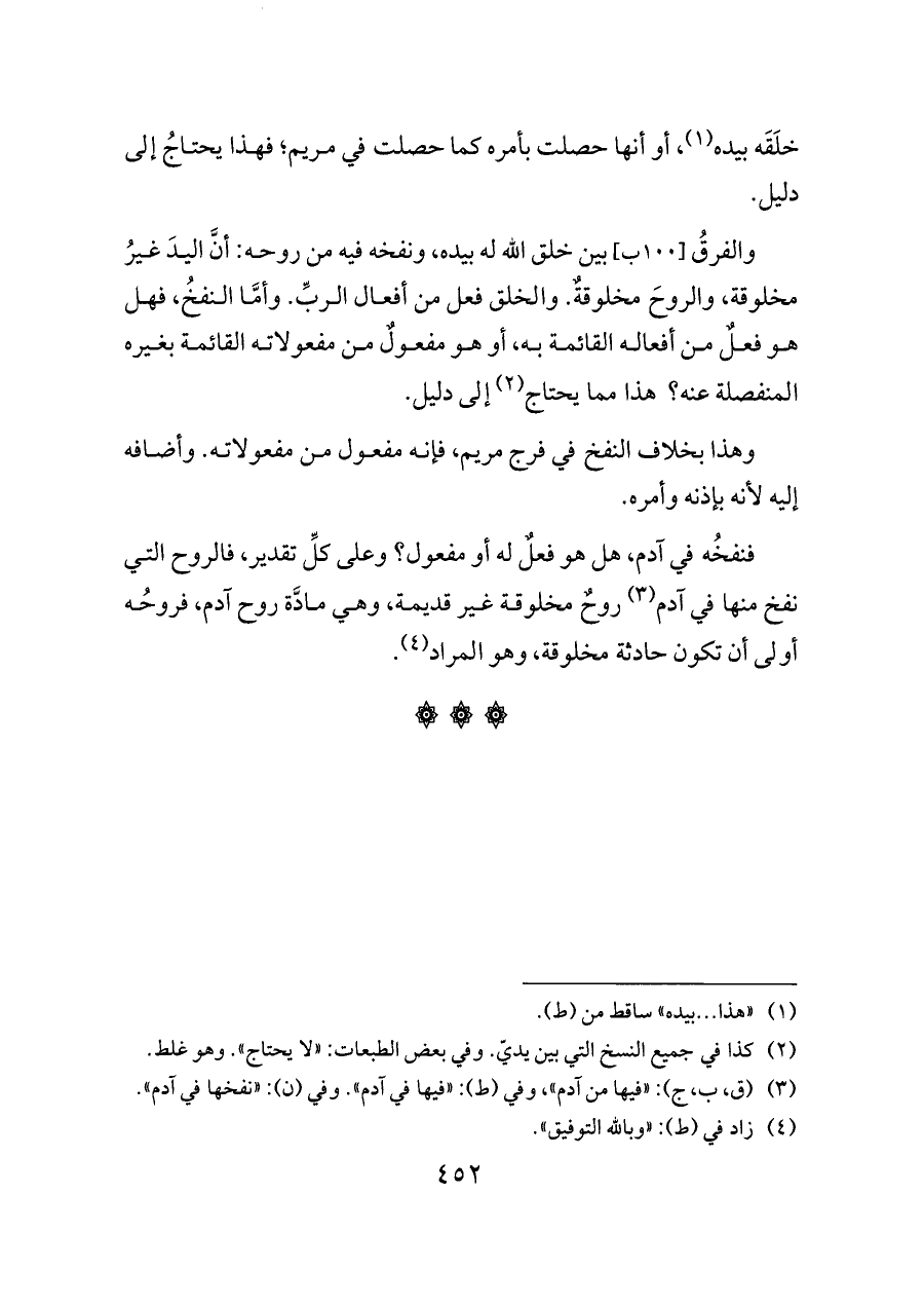 والفرقُ [١٠٠ ب] بين خلق الله له بيده، ونفخه فيه من روحه: أنَّ اليدَ غيرُ مخلوقة، والروحَ مخلوقةٌ. والخلق فعل من أفعال الربِّ. وأمَّا النفخُ، فهل هو فعلٌ من أفعاله القائمة به، أو هو مفعولٌ من مفعولاته القائمة بغيره المنفصلة عنه؟ هذا مما يحتاج (¬٢) إلى دليل.