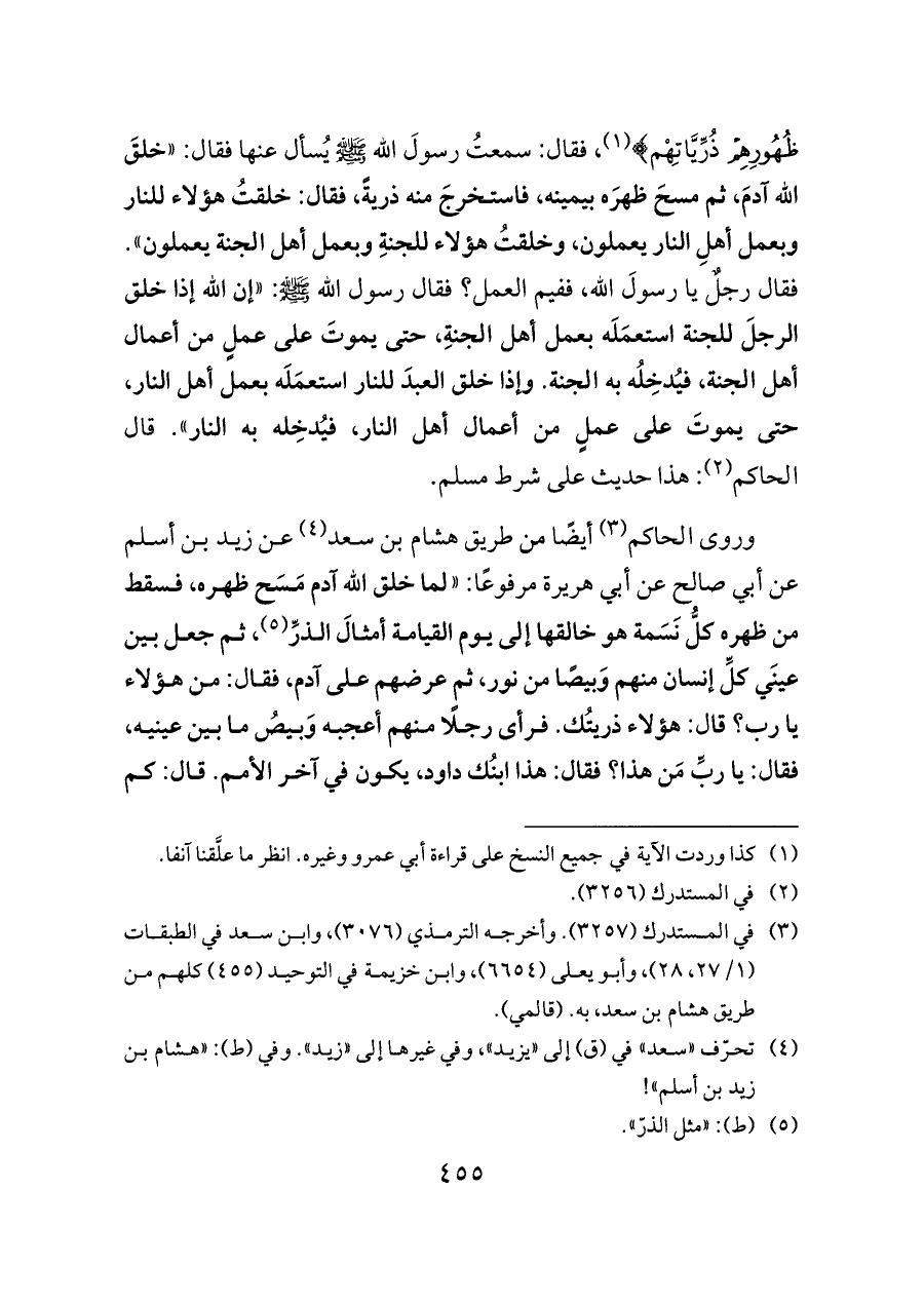 ظُهُورِهِمْ ذُرِّيَّاتِهْم} (¬١)، فقال: سمعتُ رسولَ الله - صلى الله عليه وسلم - يُسأل عنها فقال: «خلقَ الله آدمَ، ثم مسحَ ظهرَه بيمينه، فاستخرجَ منه ذريةً، فقال: خلقتُ هؤلاء للنار وبعمل أهلِ النار يعملون، وخلقتُ هؤلاء للجنةِ وبعمل أهل الجنة يعملون». فقال رجلٌ يا رسولَ الله، ففيم العمل؟ فقال رسول الله - صلى الله عليه وسلم -: «إن الله إذا خلق الرجلَ للجنة استعمَلَه بعمل أهل الجنةِ، حتى يموتَ على عملٍ من أعمال أهل الجنة، فيُدخِلُه به الجنة. وإذا خلق العبدَ للنار استعمَلَه بعمل أهل النار، حتى يموتَ على عملٍ من أعمال أهل النار، فيُدخِله به النار». قال الحاكم (¬٢): هذا حديث على شرط مسلم.