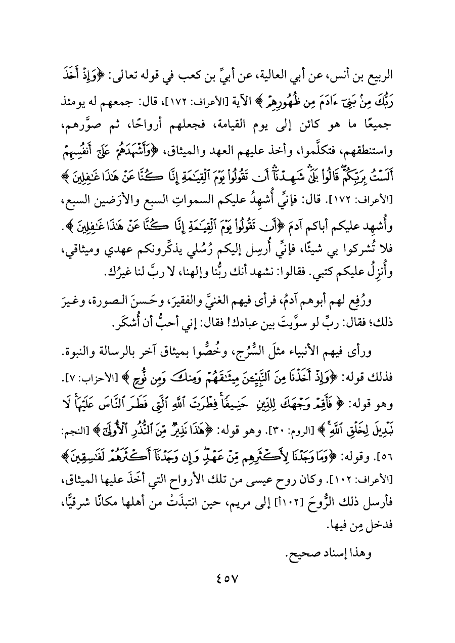 الربيع بن أنس، عن أبي العالية، عن أبيِّ بن كعب في قوله تعالى: {وَإِذْ أَخَذَ رَبُّكَ مِنْ بَنِي آدَمَ مِنْ ظُهُورِهِمْ} الآية [الأعراف: ١٧٢]، قال: جمعهم له يومئذ جميعًا ما هو كائن إلى يوم القيامة، فجعلهم أرواحًا، ثم صوَّرهم، واستنطقهم، فتكلَّموا، وأخذ عليهم العهد والميثاق، {وَأَشْهَدَهُمْ عَلَى أَنْفُسِهِمْ أَلَسْتُ بِرَبِّكُمْ قَالُوا بَلَى شَهِدْنَا أَنْ تَقُولُوا يَوْمَ الْقِيَامَةِ إِنَّا كُنَّا عَنْ هَذَا غَافِلِينَ} [الأعراف: ١٧٢]. قال: فإنِّي أُشهِدُ عليكم السمواتِ السبع والأرَضين السبع، وأُشهِد عليكم أباكم آدمَ {أَنْ تَقُولُوا يَوْمَ الْقِيَامَةِ إِنَّا كُنَّا عَنْ هَذَا غَافِلِينَ}. فلا تُشركوا بي شيئًا، فإنِّي أُرسِل إليكم رُسُلي يذكِّرونكم عهدي وميثاقي، وأُنزِلُ عليكم كتبي. فقالوا: نشهد أنك ربُّنا وإلهنا، لا ربَّ لنا غيرُك.