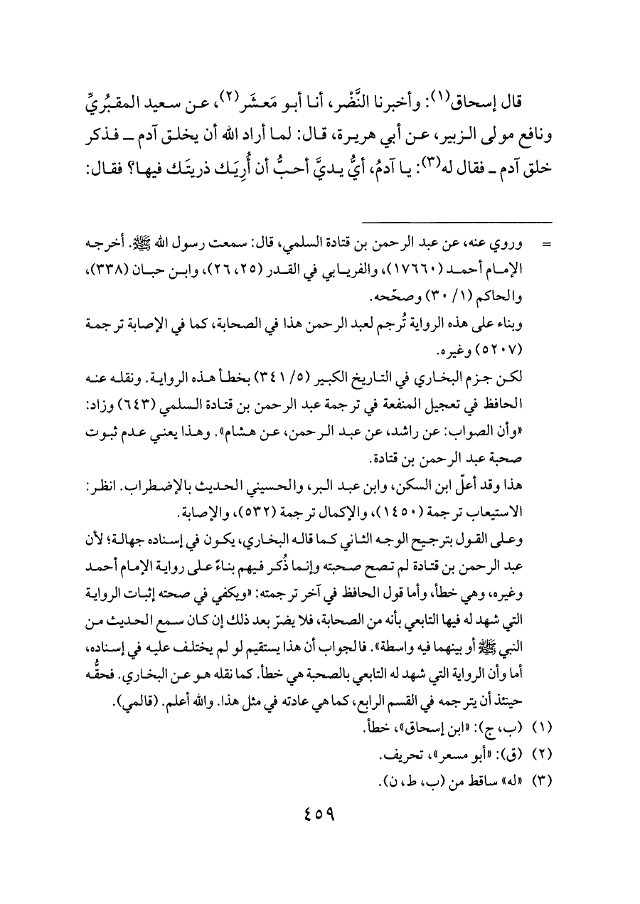 قال إسحاق (¬١): وأخبرنا النَّضْر، أنا أبو مَعشَر (¬٢)، عن سعيد المقبُريِّ ونافع مولى الزبير، عن أبي هريرة، قال: لما أراد الله أن يخلق آدم ــ فذكر خلق آدم ــ فقال له (¬٣): يا آدمُ، أيُّ يديَّ أحبُّ أن أُرِيَك ذريتَك فيها؟ فقال: