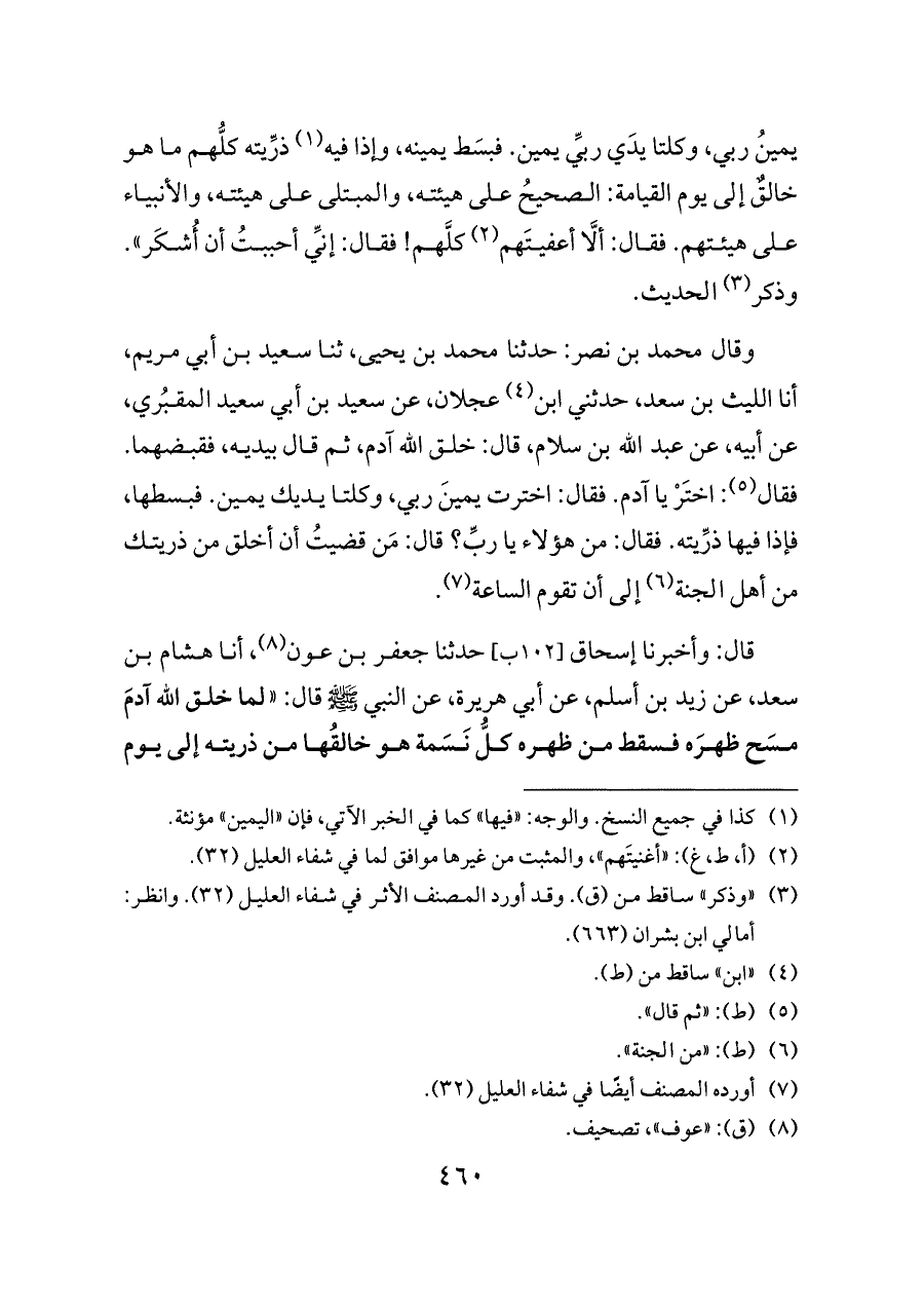 وقال محمد بن نصر: حدثنا محمد بن يحيى، ثنا سعيد بن أبي مريم، أنا الليث بن سعد، حدثني ابن (¬٤) عجلان، عن سعيد بن أبي سعيد المقبُري، عن أبيه، عن عبد الله بن سلام، قال: خلق الله آدم، ثم قال بيديه، فقبضهما. فقال (¬٥): اختَرْ يا آدم. فقال: اخترت يمينَ ربي، وكلتا يديك يمين. فبسطها، فإذا فيها ذرِّيته. فقال: من هؤلاء يا ربِّ؟ قال: مَن قضيتُ أن أخلق من ذريتك من أهل الجنة (¬٦) إلى أن تقوم الساعة (¬٧).