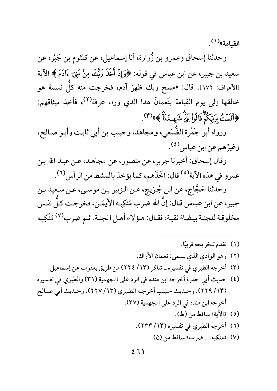 وحدثنا إسحاق وعمرو بن زُرارة، أنا إسماعيل، عن كلثوم بن جَبْر، عن سعيد بن جبير، عن ابن عباس في قوله: {وَإِذْ أَخَذَ رَبُّكَ مِنْ بَنِي آدَمَ} الآية [الأعراف: ١٧٢]. قال: «مسح ربك ظهرَ آدم، فخرجت منه كلُّ نسمة هو خالقها إلى يوم القيامة بنَعمانَ هذا الذي وراء عرفة (¬٢)، فأخذ ميثاقهم: {أَلَسْتُ بِرَبِّكُمْ قَالُوا بَلَى شَهِدْنَا}» (¬٣).