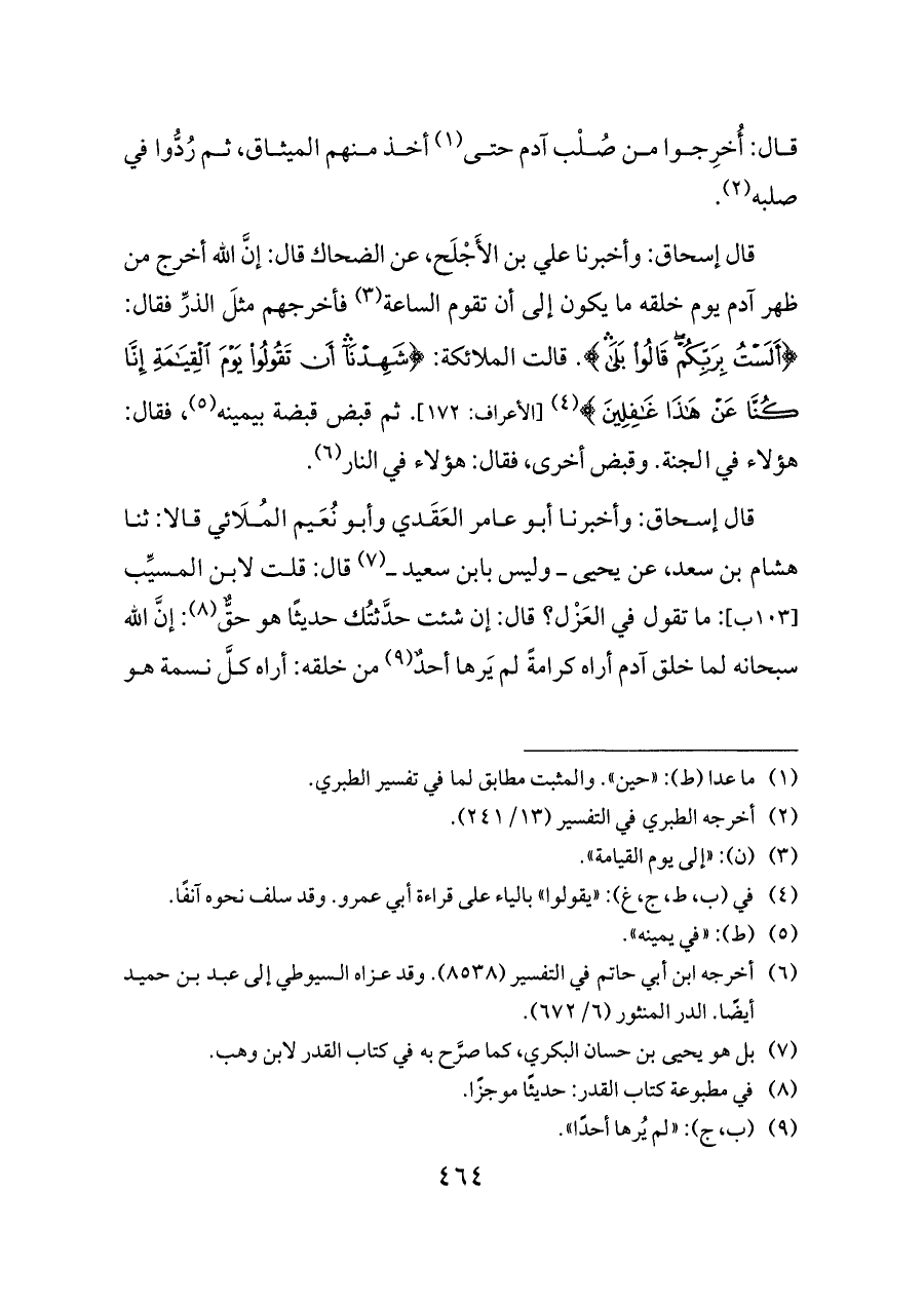 قال إسحاق: وأخبرنا علي بن الأَجْلَح (¬٣)، عن الضحاك قال: إنَّ الله أخرج من ظهر آدم يوم خلقه ما يكون إلى أن تقوم الساعة (¬٤) فأخرجهم مثلَ الذرِّ فقال: {أَلَسْتُ بِرَبِّكُمْ قَالُوا بَلَى}. قالت الملائكة: {شَهِدْنَا أَنْ تَقُولُوا يَوْمَ الْقِيَامَةِ إِنَّا كُنَّا عَنْ هَذَا غَافِلِينَ} (¬٥) [الأعراف: ١٧٢]. ثم قبض قبضة بيمينه (¬٦)، فقال: هؤلاء في الجنة. وقبض أخرى، فقال: هؤلاء في النار (¬٧).