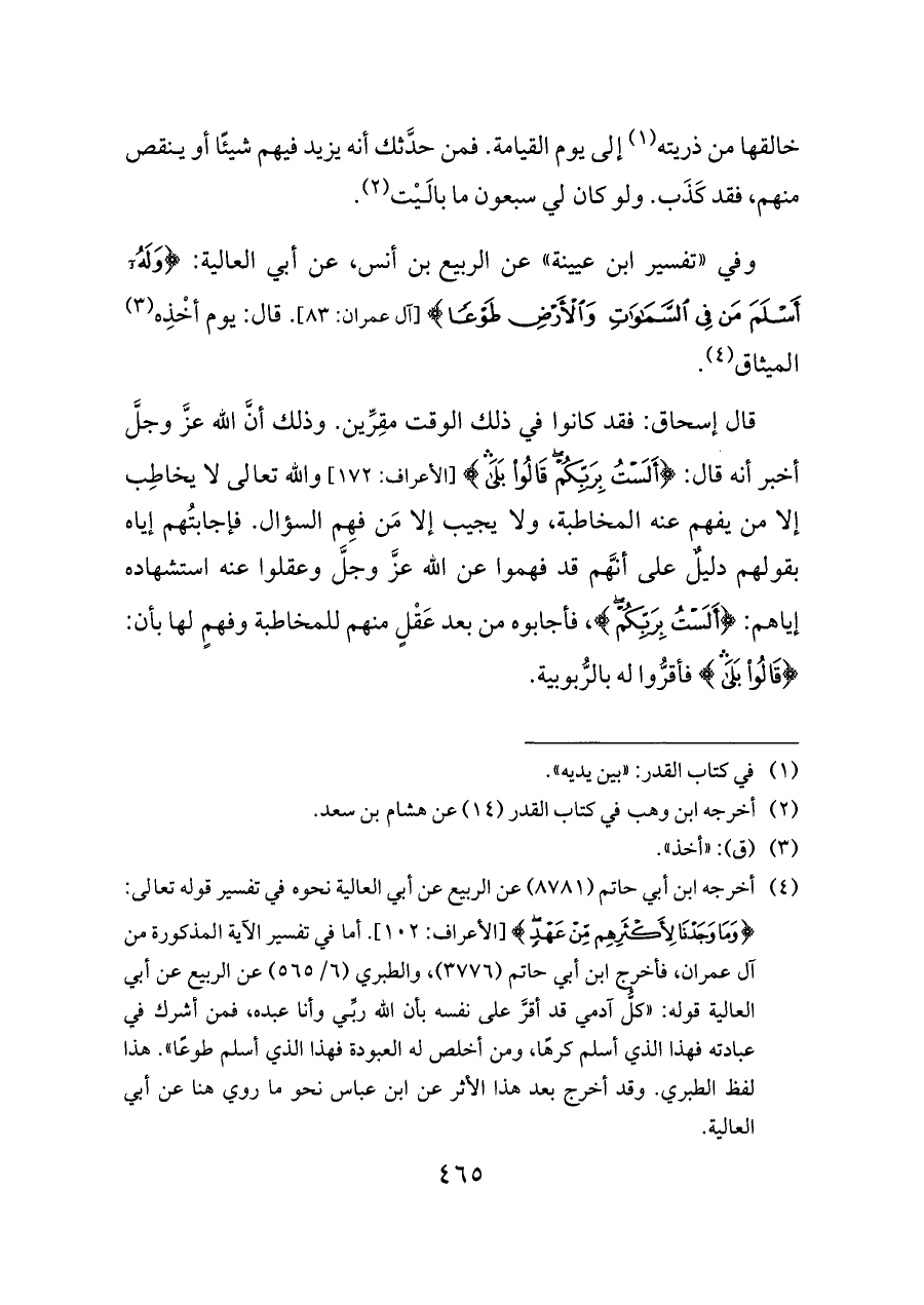 (¬٤) أخرجه ابن أبي حاتم (٨٧٨١) عن الربيع عن أبي العالية نحوه في تفسير قوله تعالى: {وَمَا وَجَدْنَا لِأَكْثَرِهِمْ مِنْ عَهْدٍ} [الأعراف: ١٠٢]. أما في تفسير الآية المذكورة من آل عمران، فأخرج ابن أبي حاتم (٣٧٧٦)، والطبري (٦/ ٥٦٥) عن الربيع عن أبي العالية قوله: «كلُّ آدمي قد أقرَّ على نفسه بأن الله ربِّي وأنا عبده، فمن أشرك في عبادته فهذا الذي أسلم كرهًا، ومن أخلص له العبودة فهذا الذي أسلم طوعًا». هذا لفظ الطبري. وقد أخرج بعد هذا الأثر عن ابن عباس نحو ما روي هنا عن أبي العالية.