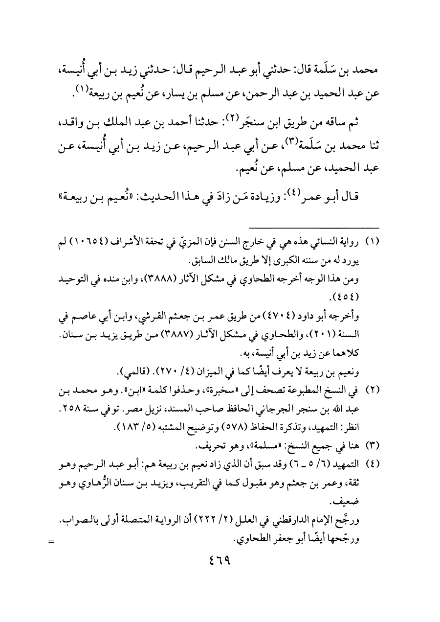 (¬٤) التمهيد (٦/ ٥ ــ ٦) وقد سبق أن الذي زاد نعيم بن ربيعة هم: أبو عبد الرحيم وهو ثقة، وعمر بن جعثم وهو مقبول كما في التقريب، ويزيد بن سنان الرُّهاوي وهو ضعيف.