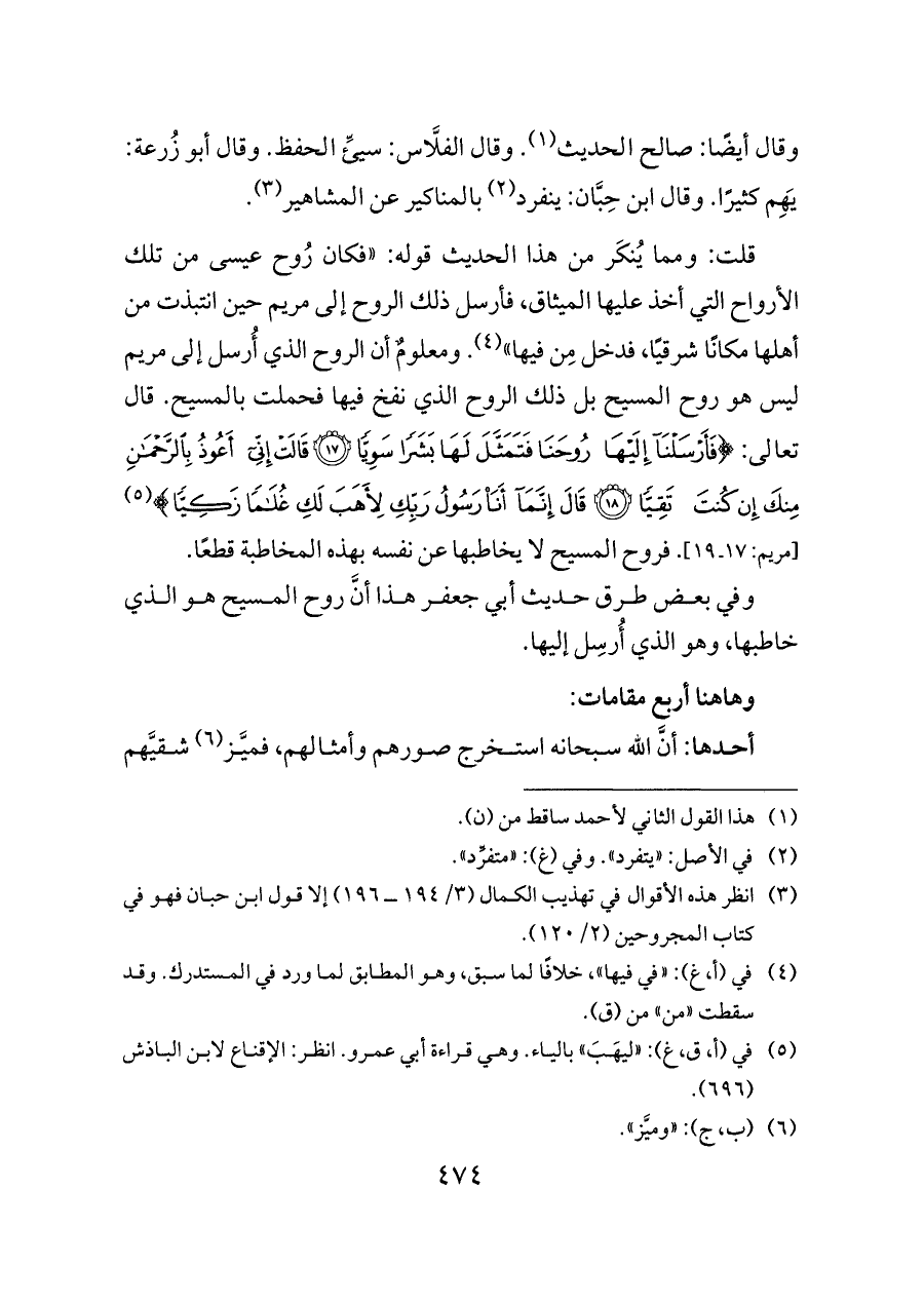 قلت: ومما يُنكَر من هذا الحديث قوله: «فكان رُوح عيسى من تلك الأرواح التي أخذ عليها الميثاق، فأرسل ذلك الروح إلى مريم حين انتبذت من أهلها مكانًا شرقيًا، فدخل مِن فيها» (¬٤). ومعلومٌ أن الروح الذي أُرسل إلى مريم ليس هو روح المسيح بل ذلك الروح الذي نفخ فيها فحملت بالمسيح. قال تعالى: {فَأَرْسَلْنَا إِلَيْهَا رُوحَنَا فَتَمَثَّلَ لَهَا بَشَرًا سَوِيًّا (١٧) قَالَتْ إِنِّي أَعُوذُ بِالرَّحْمَنِ مِنْكَ إِنْ كُنْتَ تَقِيًّا (١٨) قَالَ إِنَّمَا أَنَا رَسُولُ رَبِّكِ لِأَهَبَ لَكِ غُلَامًا زَكِيًّا} (¬٥) [مريم: ١٧ ـ ١٩]. فروح المسيح لا يخاطبها عن نفسه بهذه المخاطبة قطعًا.
