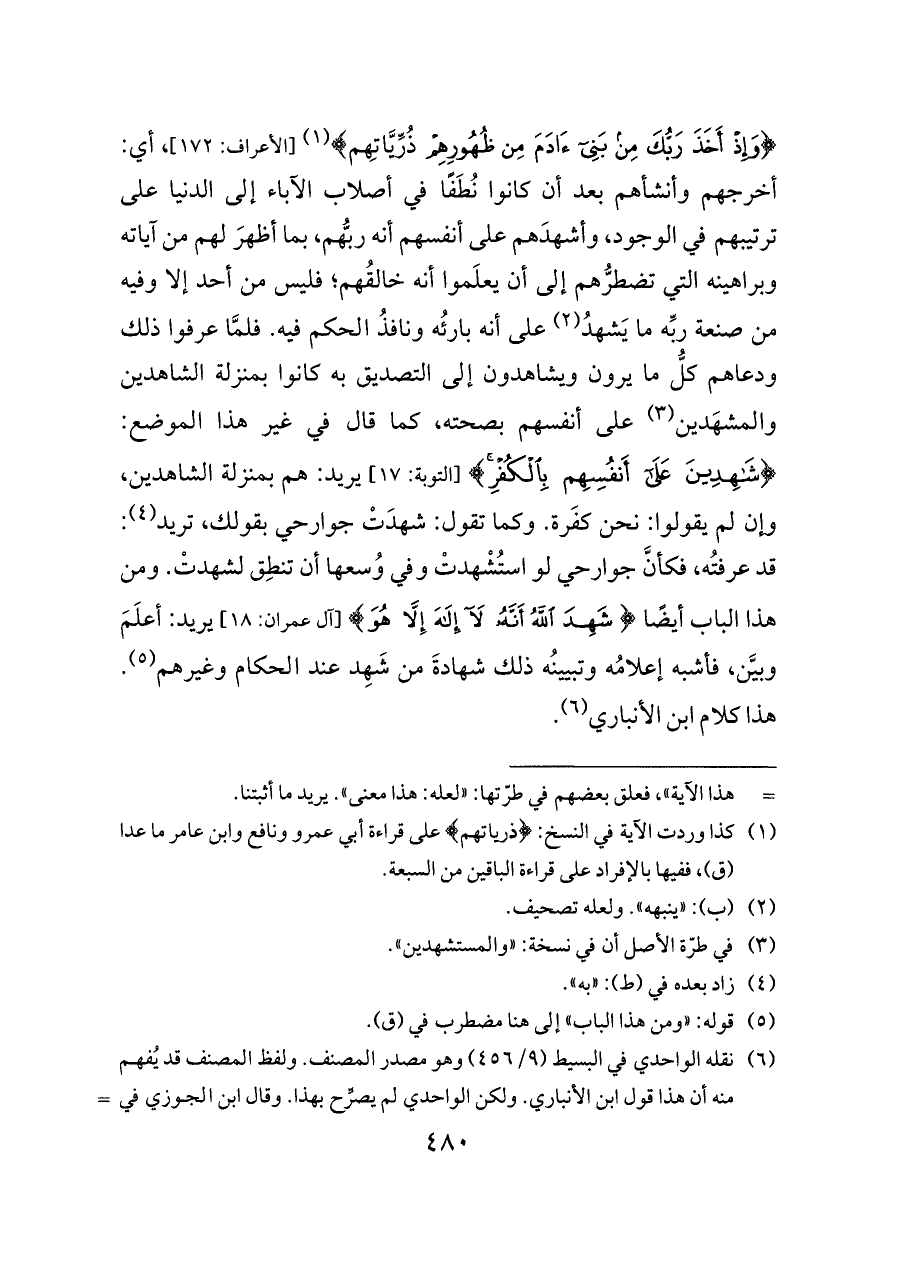 {وَإِذْ أَخَذَ رَبُّكَ مِنْ بَنِي آدَمَ مِنْ ظُهُورِهِمْ ذُرِّيَّاتِهم} (¬١) [الأعراف: ١٧٢]، أي: أخرجهم وأنشأهم بعد أن كانوا نُطَفًا في أصلاب الآباء إلى الدنيا على ترتيبهم في الوجود، وأشهدَهم على أنفسهم أنه ربُّهم، بما أظهرَ لهم من آياته وبراهينه التي تضطرُّهم إلى أن يعلَموا أنه خالقُهم؛ فليس من أحد إلا وفيه من صنعة ربِّه ما يَشهدُ (¬٢) على أنه بارئُه ونافذُ الحكم فيه. فلمَّا عرفوا ذلك ودعاهم كلُّ ما يرون ويشاهدون إلى التصديق به كانوا بمنزلة الشاهدين والمشهَدين (¬٣) على أنفسهم بصحته، كما قال في غير هذا الموضع: {شَاهِدِينَ عَلَى أَنْفُسِهِمْ بِالْكُفْرِ} [التوبة: ١٧] يريد: هم بمنزلة الشاهدين، وإن لم يقولوا: نحن كفَرة. وكما تقول: شهدَتْ جوارحي بقولك، تريد (¬٤): قد عرفتُه، فكأنَّ جوارحي لو استُشْهدتْ وفي وُسعها أن تنطِق لشهدتْ. ومن هذا الباب أيضًا {شَهِدَ اللَّهُ أَنَّهُ لَا إِلَهَ إِلَّا هُوَ} [آل عمران: ١٨] يريد: أعلَمَ وبيَّن، فأشبه إعلامُه وتبيينُه ذلك شهادةَ من شَهِد عند الحكام وغيرهم (¬٥). هذا كلام ابن الأنباري (¬٦).