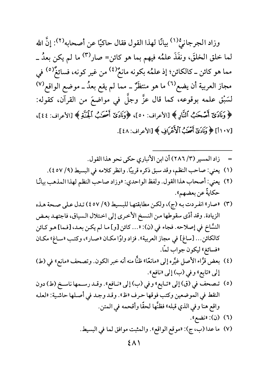 (¬٣) «صار» انفردت به (ج)، ولكن مطابقتها للبسيط (٩/ ٤٥٧) تدل على صحة هذه الزيادة. وقد أدّى سقوطها من النسخ الأخرى إلى اختلال السياق، فاجتهد بعض النسَّاخ في إصلاحه. فجاء في (ن): « ... كائن [و] ما لم يكن بعد، [فما] هو كائن كالكائن ... [ساغ] في مجاز العربية». فزاد واوًا مكان «صار»، وكتب «ساغ» مكان «فسائغ» ليكون جواب لمّا.