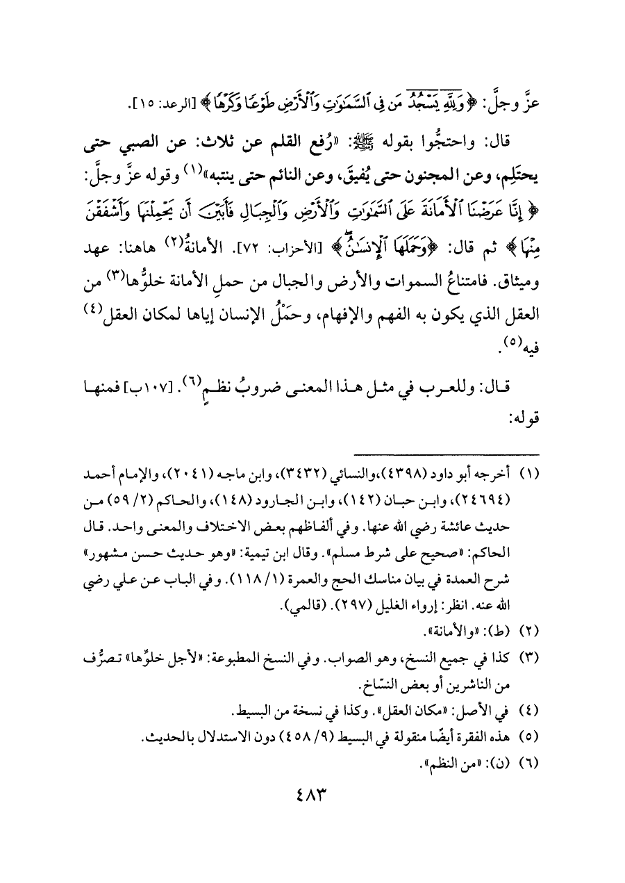 قال: واحتجُّوا بقوله - صلى الله عليه وسلم -: «رُفع القلم عن ثلاث: عن الصبي حتى يحتَلِم، وعن المجنون حتى يُفيقَ، وعن النائم حتى ينتبه» (¬١) وقوله عزَّ وجلَّ: {إِنَّا عَرَضْنَا الْأَمَانَةَ عَلَى السَّمَاوَاتِ وَالْأَرْضِ وَالْجِبَالِ فَأَبَيْنَ أَنْ يَحْمِلْنَهَا وَأَشْفَقْنَ مِنْهَا} ثم قال: {وَحَمَلَهَا الْإِنْسَانُ} [الأحزاب: ٧٢]. الأمانةُ (¬٢) هاهنا: عهد وميثاق. فامتناعُ السموات والأرض والجبال من حملِ الأمانة خلوُّها (¬٣) من العقل الذي يكون به الفهم والإفهام، وحَمْلُ الإنسان إياها لمكان العقل (¬٤) فيه (¬٥).