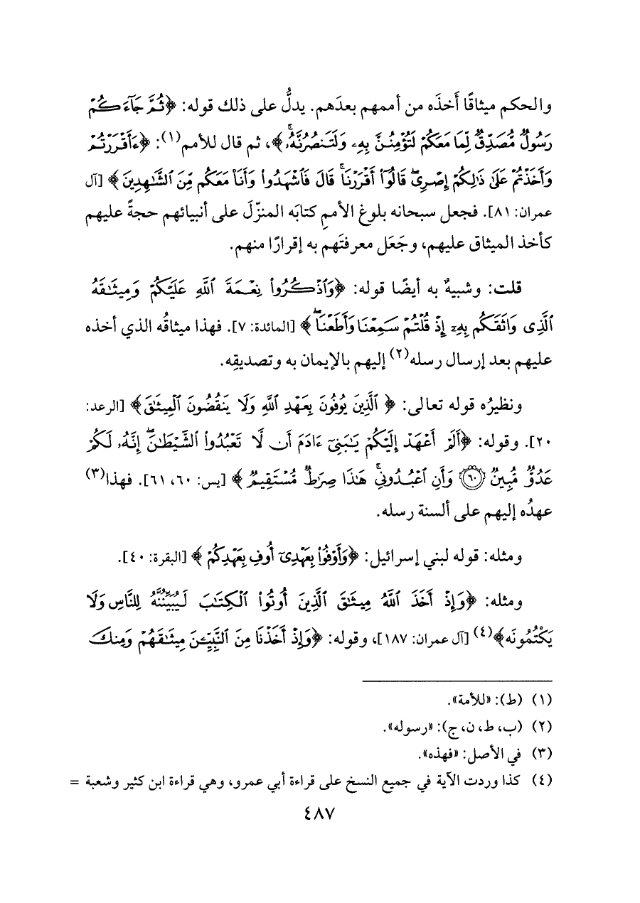 ومثله: {وَإِذْ أَخَذَ اللَّهُ مِيثَاقَ الَّذِينَ أُوتُوا الْكِتَابَ لَيُبَيِّنُنَّهُ لِلنَّاسِ وَلَا يَكْتُمُونَه} (¬٤) [آل عمران: ١٨٧]، وقوله: {وَإِذْ أَخَذْنَا مِنَ النَّبِيِّينَ مِيثَاقَهُمْ وَمِنْكَ