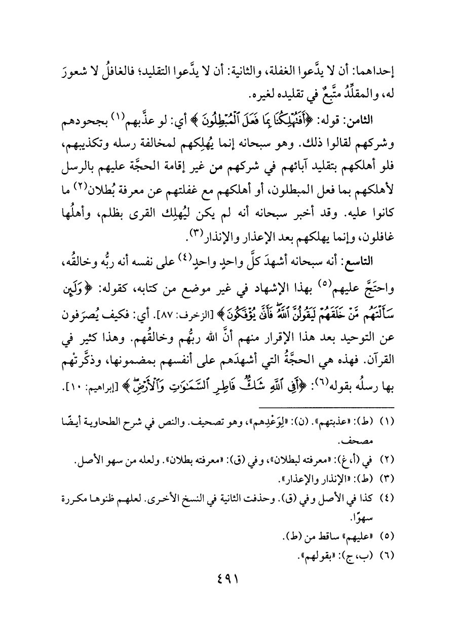 الثامن: قوله: {أَفَتُهْلِكُنَا بِمَا فَعَلَ الْمُبْطِلُونَ} أي: لو عذَّبهم (¬١) بجحودهم وشركهم لقالوا ذلك. وهو سبحانه إنما يُهلِكهم لمخالفة رسله وتكذيبهم، فلو أهلكهم بتقليد آبائهم في شركهم من غير إقامة الحجَّة عليهم بالرسل لأهلكهم بما فعل المبطلون، أو أهلكهم مع غفلتهم عن معرفة بُطلان (¬٢) ما كانوا عليه. وقد أخبر سبحانه أنه لم يكن ليُهلِك القرى بظلم، وأهلُها غافلون، وإنما يهلكهم بعد الإعذار والإنذار (¬٣).
