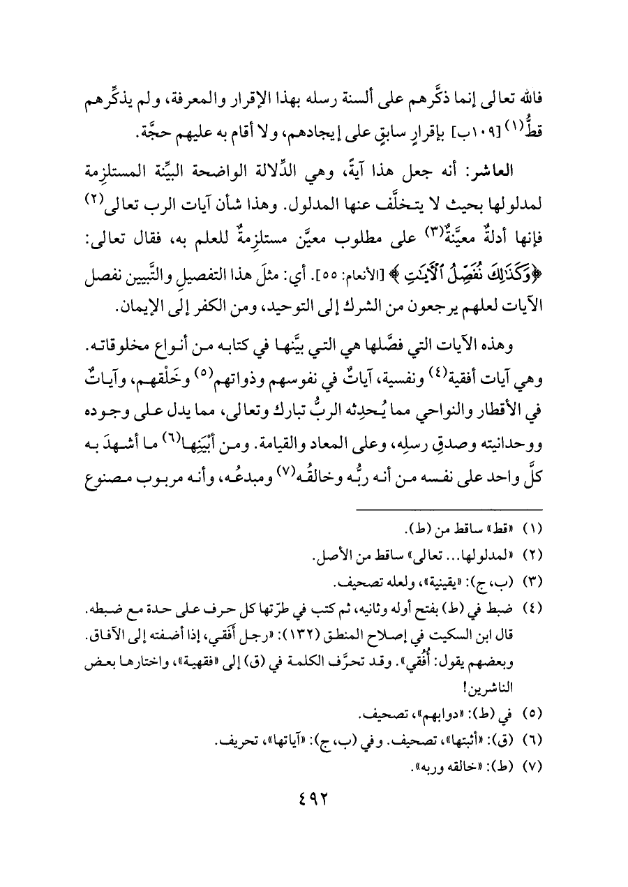 وهذه الآيات التي فصَّلها هي التي بيَّنها في كتابه من أنواع مخلوقاته. وهي آيات أفقية (¬٤) ونفسية، آياتٌ في نفوسهم وذواتهم (¬٥) وخَلْقهم، وآياتٌ في الأقطار والنواحي مما يُحدِثه الربُّ تبارك وتعالى، مما يدل على وجوده ووحدانيته وصدقِ رسلِه، وعلى المعاد والقيامة. ومن أبْيَنِها (¬٦) ما أشهدَ به كلَّ واحد على نفسه من أنه ربُّه وخالقُه (¬٧) ومبدعُه، وأنه مربوب مصنوع