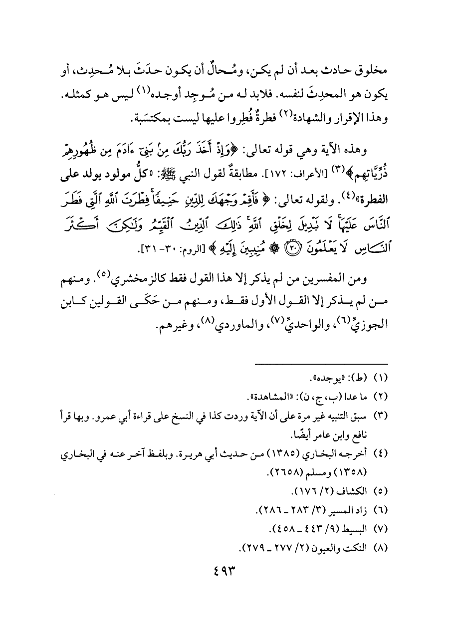 وهذه الآية وهي قوله تعالى: {وَإِذْ أَخَذَ رَبُّكَ مِنْ بَنِي آدَمَ مِنْ ظُهُورِهِمْ ذُرِّيَّاتِهم} (¬٣) [الأعراف: ١٧٢]. مطابقةٌ لقول النبي - صلى الله عليه وسلم -: «كلُّ مولود يولد على الفطرة» (¬٤). ولقوله تعالى: {فَأَقِمْ وَجْهَكَ لِلدِّينِ حَنِيفًا فِطْرَتَ اللَّهِ الَّتِي فَطَرَ النَّاسَ عَلَيْهَا لَا تَبْدِيلَ لِخَلْقِ اللَّهِ ذَلِكَ الدِّينُ الْقَيِّمُ وَلَكِنَّ أَكْثَرَ النَّاسِ لَا يَعْلَمُونَ (٣٠) مُنِيبِينَ إِلَيْهِ} [الروم: ٣٠ - ٣١].