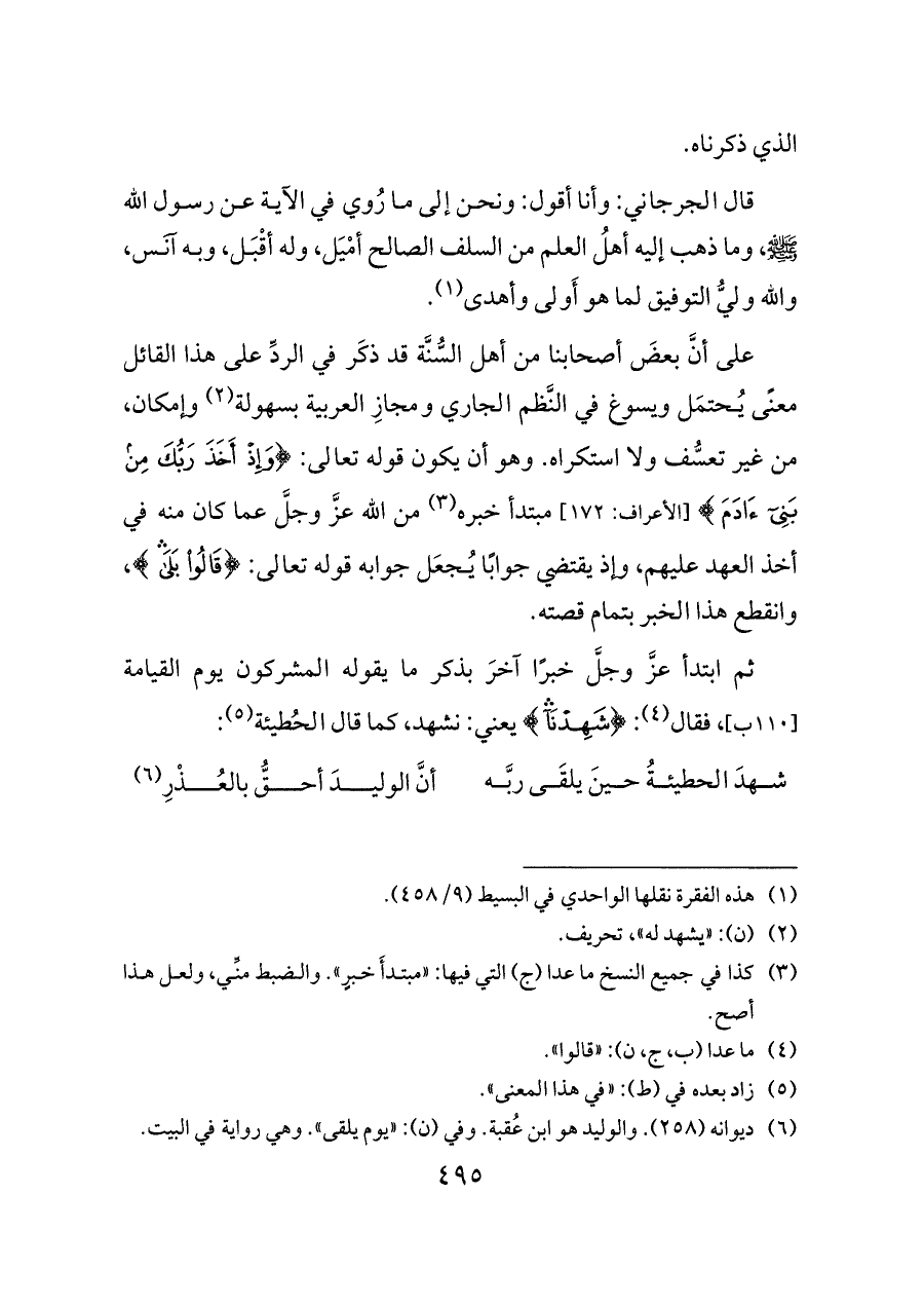 قال الجرجاني: وأنا أقول: ونحن إلى ما رُوي في الآية عن رسول الله - صلى الله عليه وسلم -، وما ذهب إليه أهلُ العلم من السلف الصالح أمْيَل، وله أقْبَل، وبه آنَس، والله وليُّ التوفيق لما هو أَولى وأهدى (¬١).