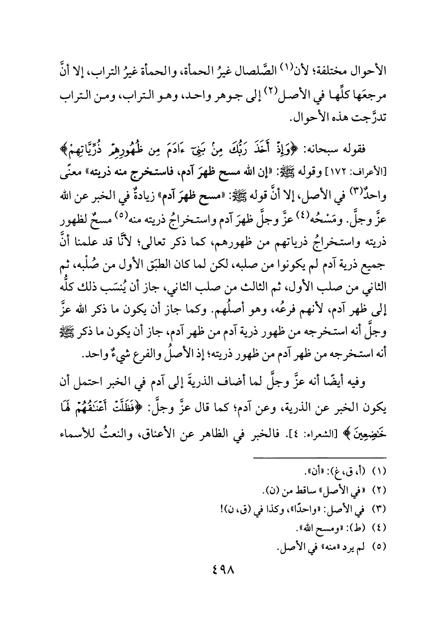 فقوله سبحانه: {وَإِذْ أَخَذَ رَبُّكَ مِنْ بَنِي آدَمَ مِنْ ظُهُورِهِمْ ذُرِّيَّاتِهمْ} [الأعراف: ١٧٢] وقوله - صلى الله عليه وسلم -: «إن الله مسح ظهرَ آدم، فاستخرج منه ذريته» معنًى واحدٌ (¬٣) في الأصل، إلا أنَّ قوله - صلى الله عليه وسلم -: «مسح ظهرَ آدم» زيادةٌ في الخبر عن الله عزَّ وجلَّ. ومَسْحُه (¬٤) عزَّ وجلَّ ظهرَ آدم واستخراجُ ذريته منه (¬٥) مسحٌ لظهور ذريته واستخراجُ ذرياتهم من ظهورهم، كما ذكر تعالى؛ لأنَّا قد علمنا أنَّ جميع ذرية آدم لم يكونوا من صلبه، لكن لما كان الطبَق الأول من صُلْبه، ثم الثاني من صلب الأول، ثم الثالث من صلب الثاني، جاز أن يُنسَب ذلك كلُّه إلى ظهر آدم، لأنهم فرعُه، وهو أصلُهم. وكما جاز أن يكون ما ذكر الله عزَّ وجلَّ أنه استخرجه من ظهور ذرية آدم من ظهر آدم، جاز أن يكون ما ذكر - صلى الله عليه وسلم - أنه استخرجه من ظهر آدم من ظهور ذريته؛ إذ الأصلُ والفرع شيءٌ واحد.