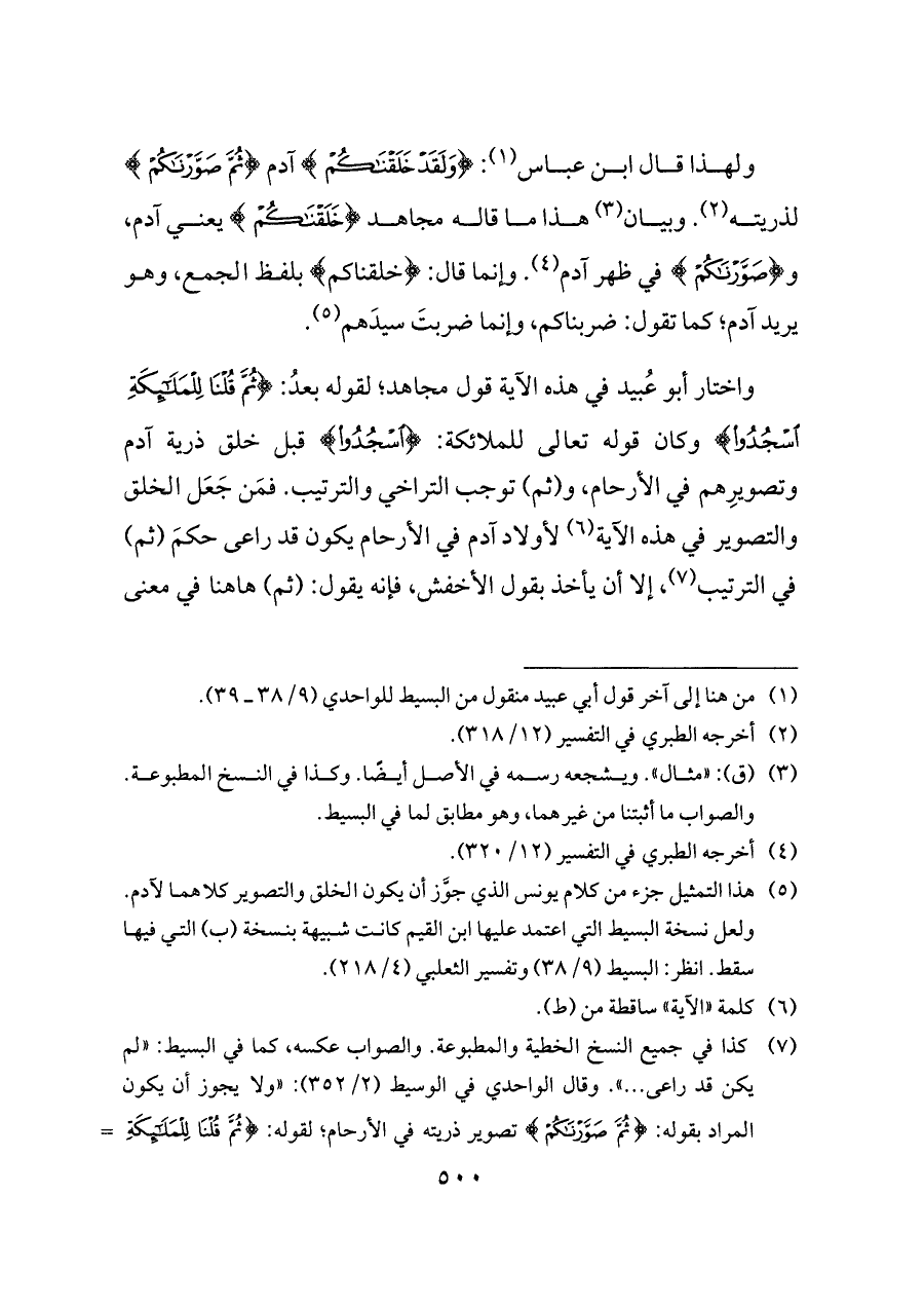 (¬٧) كذا في جميع النسخ الخطية والمطبوعة. والصواب عكسه، كما في البسيط: «لم يكن قد راعى ... ». وقال الواحدي في الوسيط (٢/ ٣٥٢): «ولا يجوز أن يكون المراد بقوله: {ثُمَّ صَوَّرْنَاكُمْ} تصوير ذريته في الأرحام؛ لقوله: {ثُمَّ قُلْنَا لِلْمَلَائِكَةِ اسْجُدُوا لِآدَمَ}، لأن هذا كان قبل تصوير ذرية آدم في الأرحام.