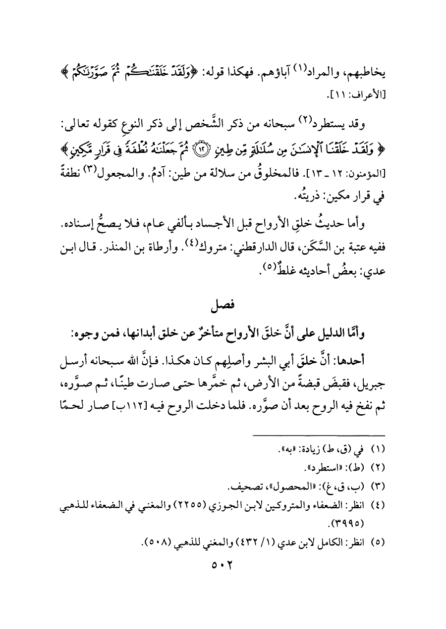 وأمَّا الدليل على أنَّ خلقَ الأرواح متأخرٌ عن خلق أبدانها، فمن وجوه: